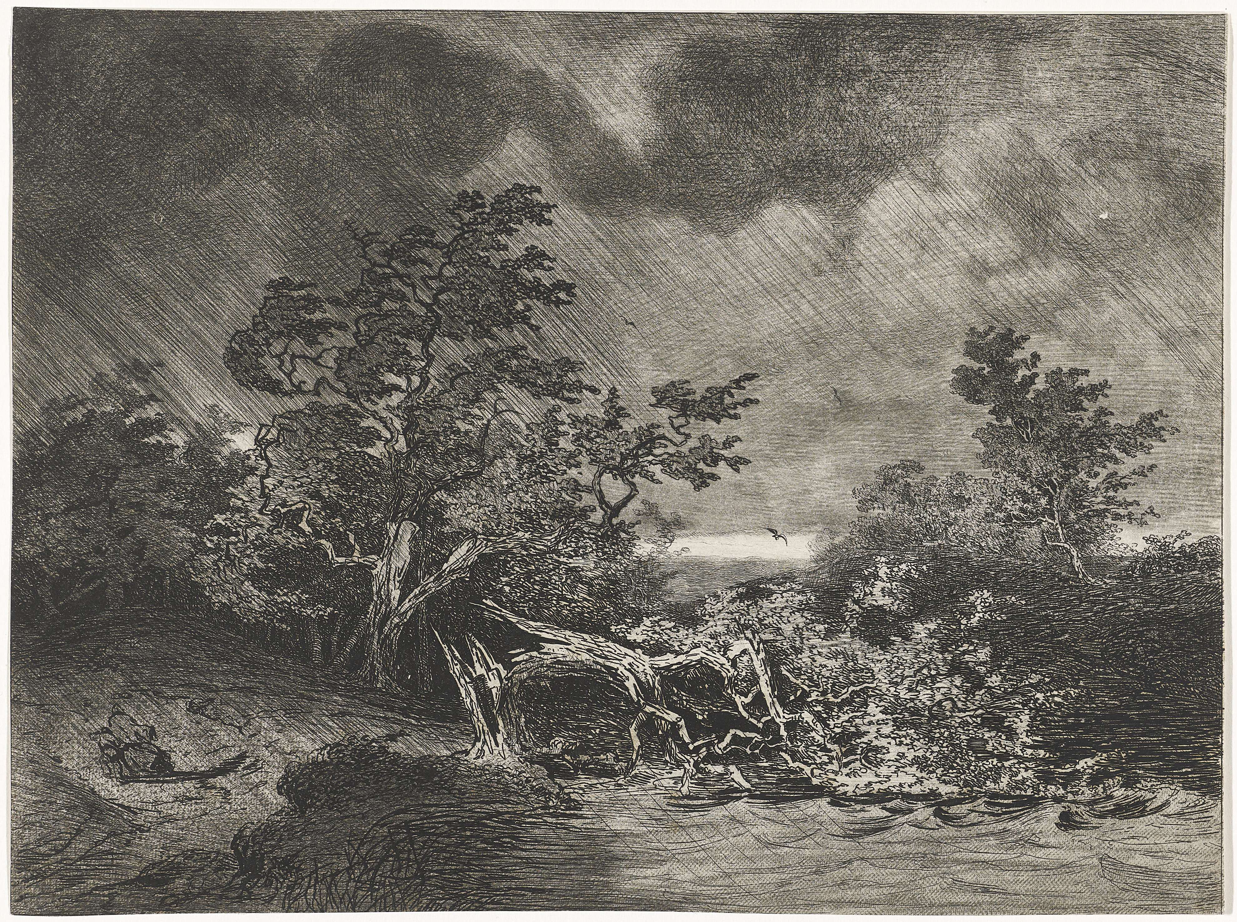 Een storm jaagt door een stuk bos met een poel. In het midden is een boom omgewaaid en rechts slaan de golven van het meer tegen het land. Links lopen twee figuren over een bospad, hun kleding wappert in de wind.