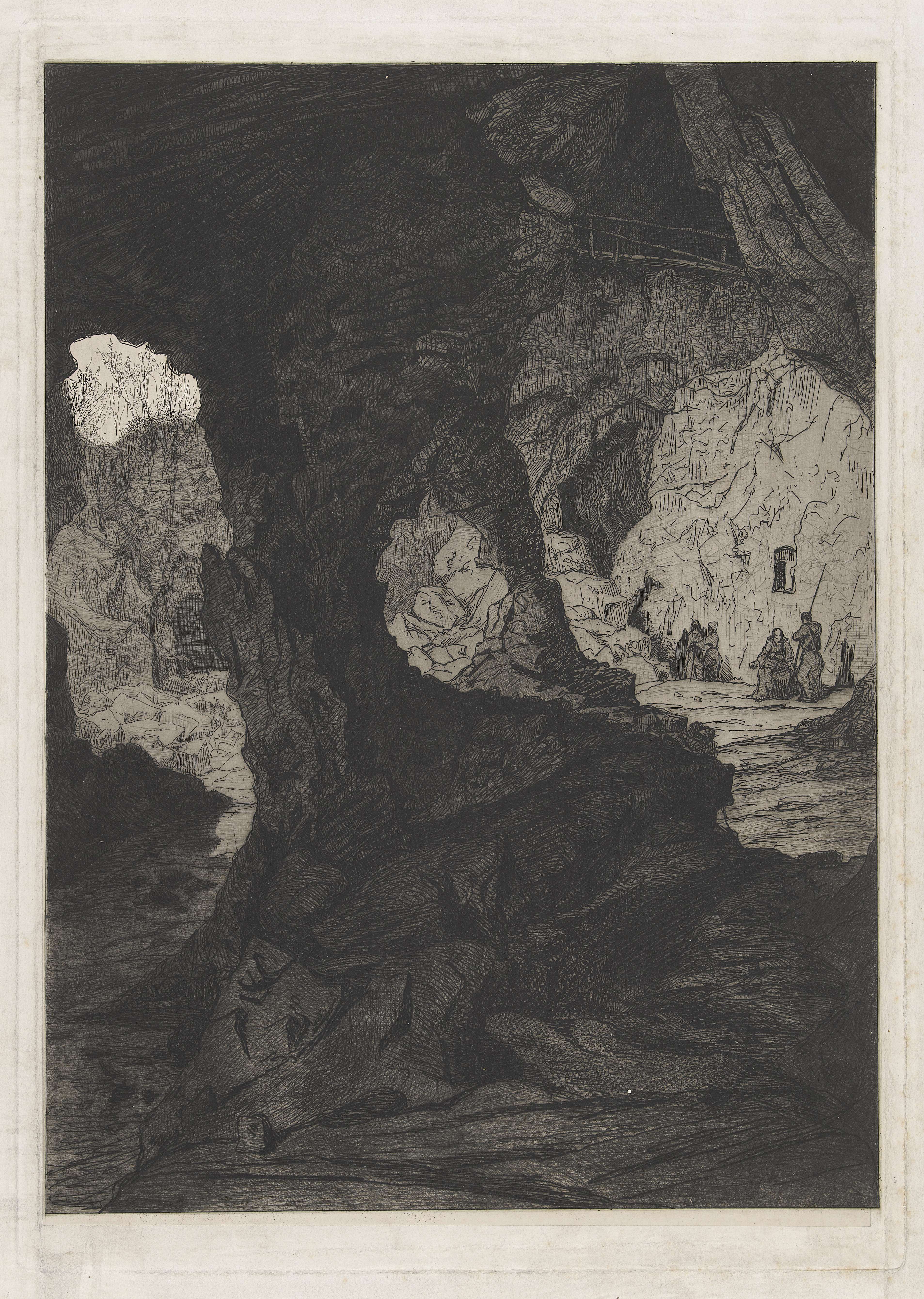 Gezicht op een grot waar vier monniken doorheen wandelen.