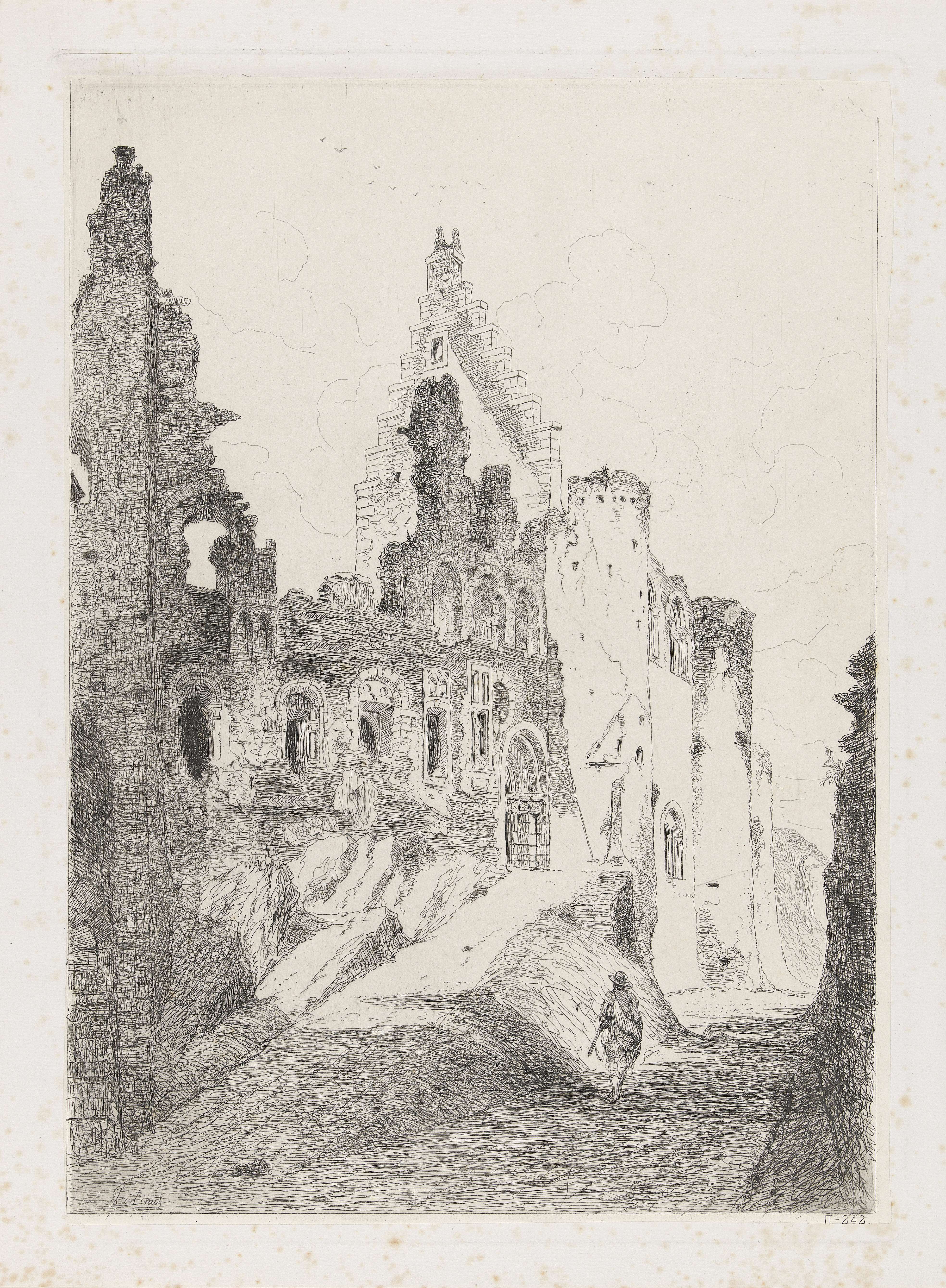Langs de ruïne van het kasteel Vianden loopt een reiziger.