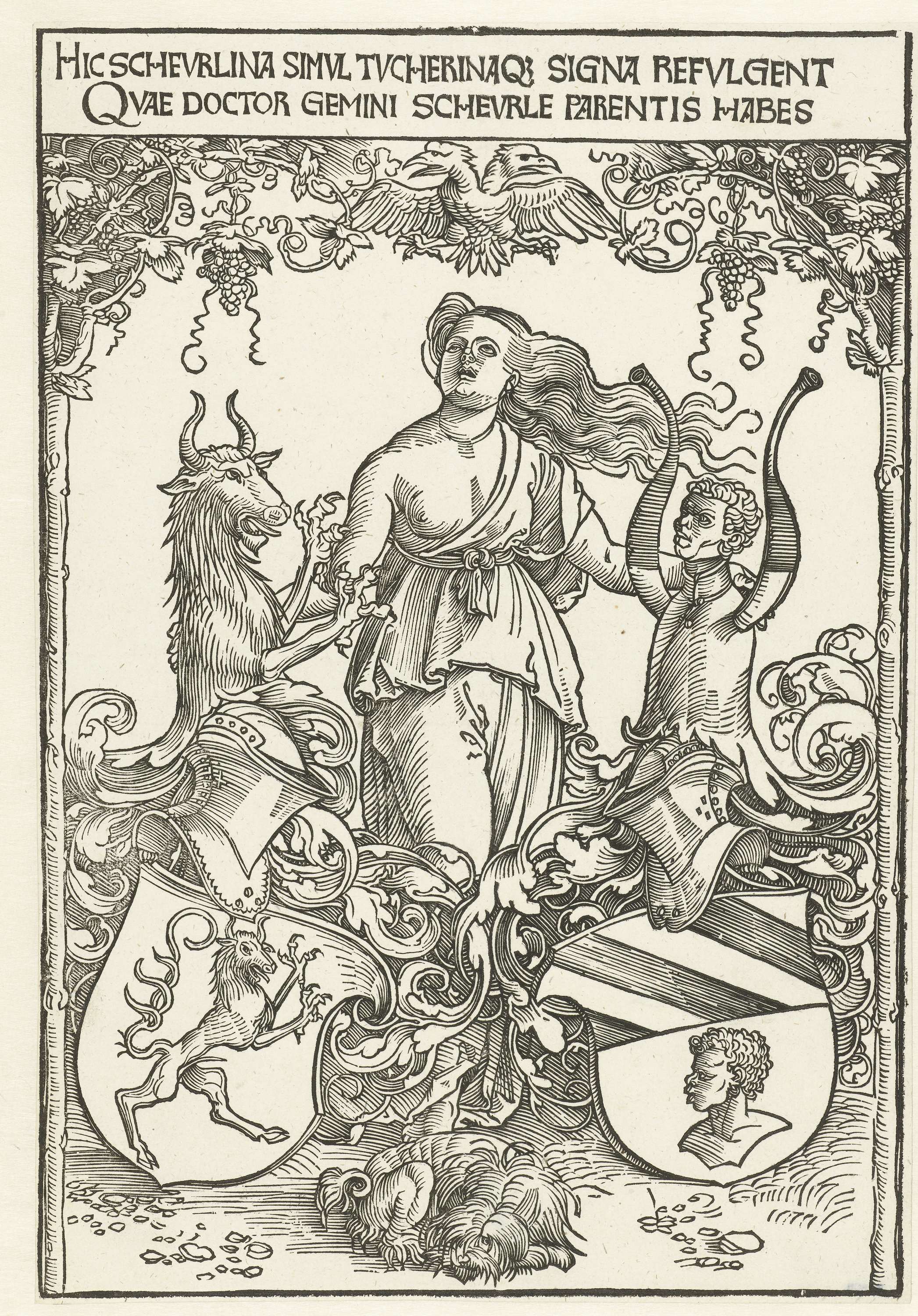 Wapens van de ouders van Christoph Scheurl (Christoph Scheurl en Helena Tucher geheten), bijeengehouden door een jongedame met wapperende haren. Op de voorgrond een hondje. Boven de voorstelling twee regels tekst in het Latijn.