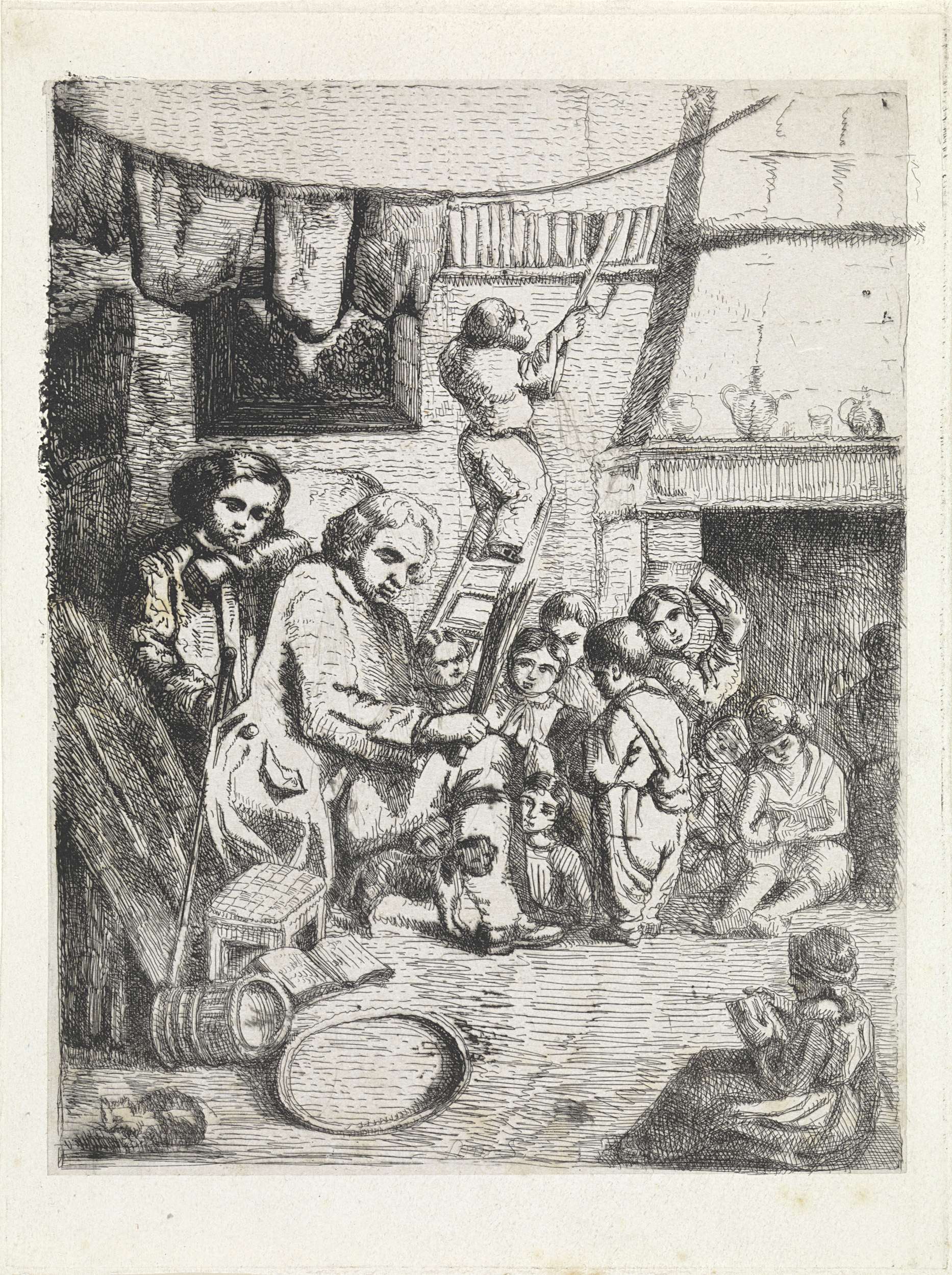 Schoolmeester omringd door kinderen