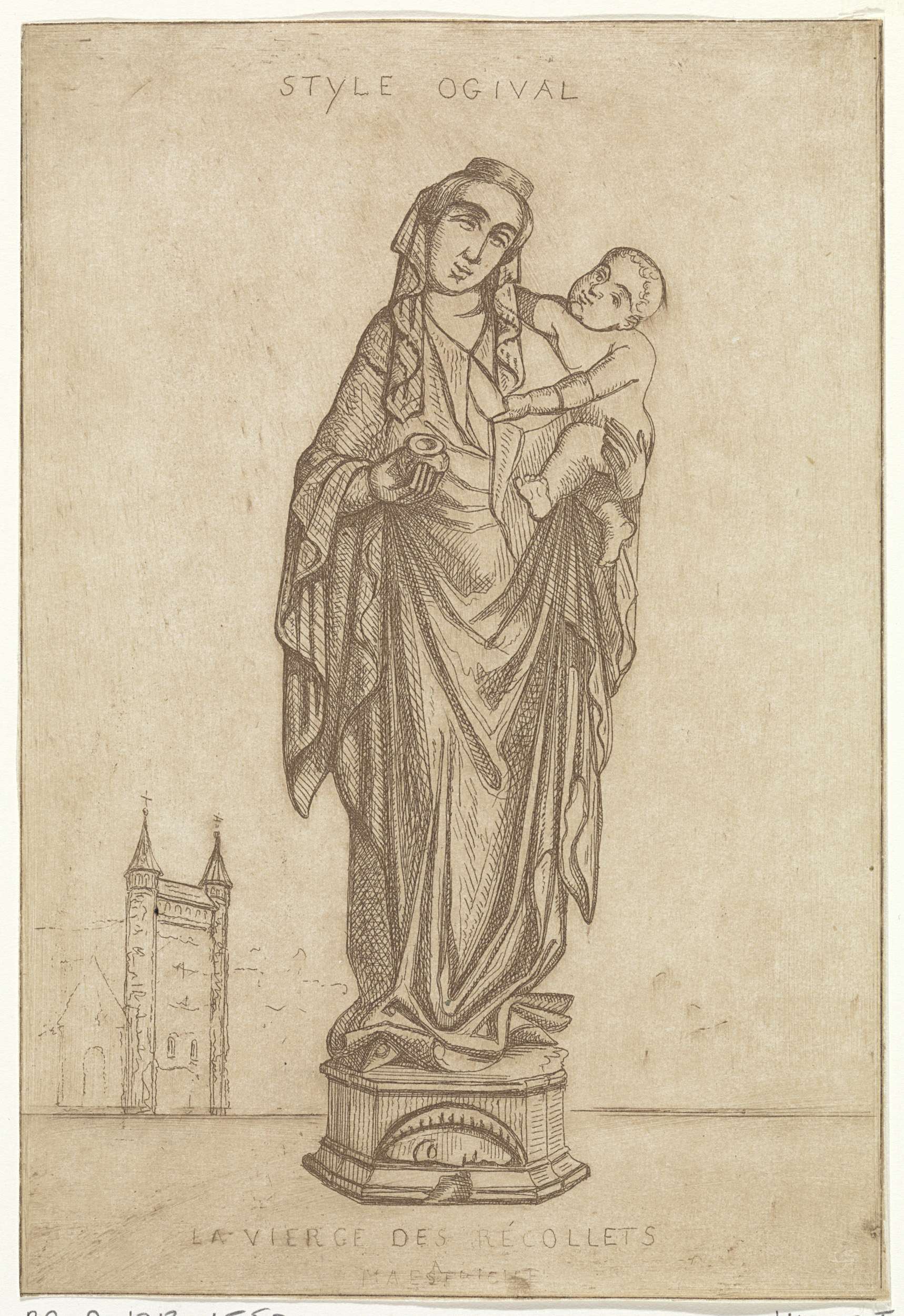 Op de achtergrond de Onze-Lieve-Vrouwe-Basiliek en de De Mérodekapel, de locatie van de sculptuur.