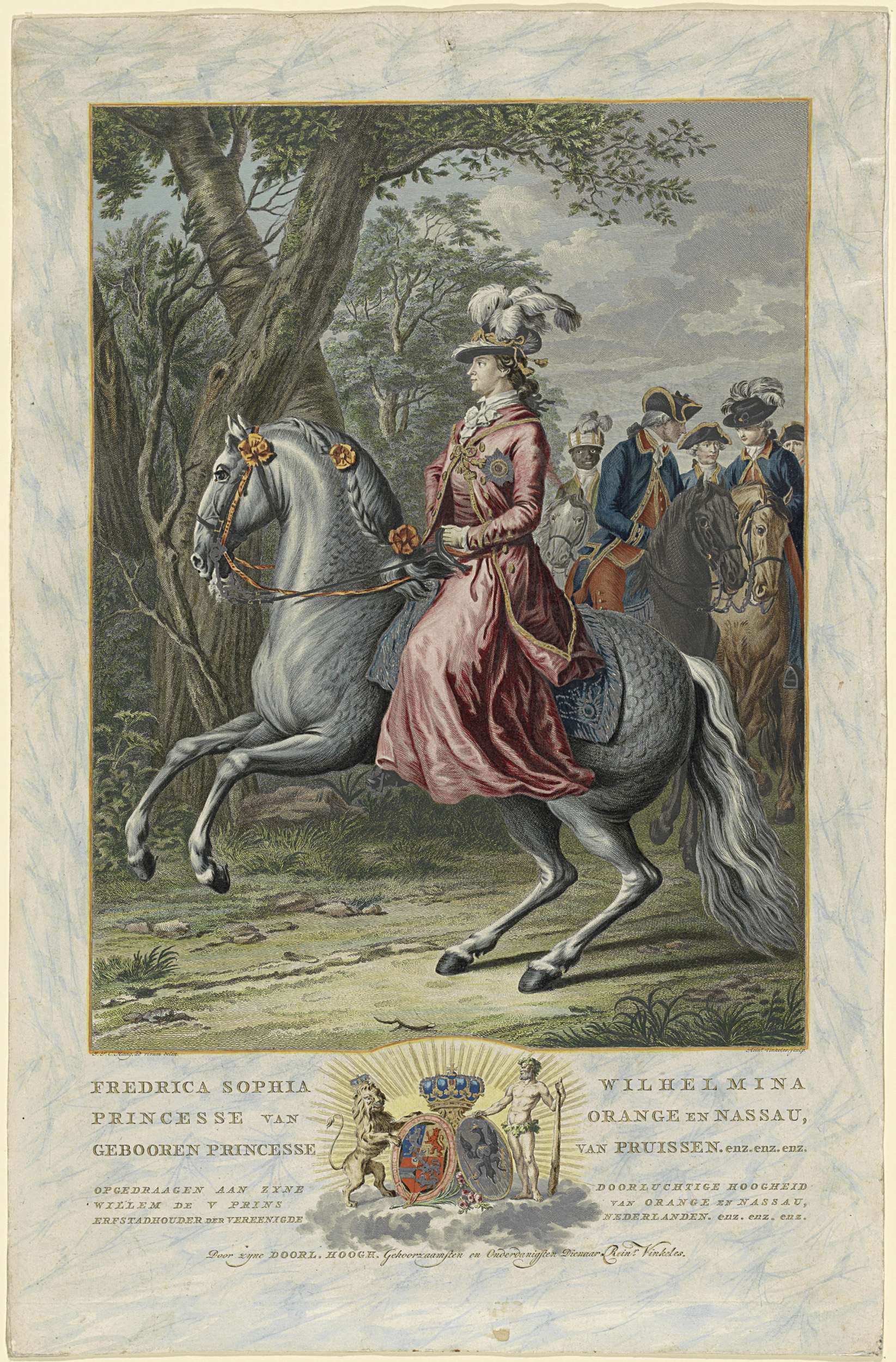 Ruiterportret van Wilhelmina. Midden onder haar wapen en het wapen van Willem V, gedecoreerd met de Kousenband en het devies van de Orde van de Kousenband, met een kroon, een leeuw en Hercules. In de ondermarge haar naam en titels.