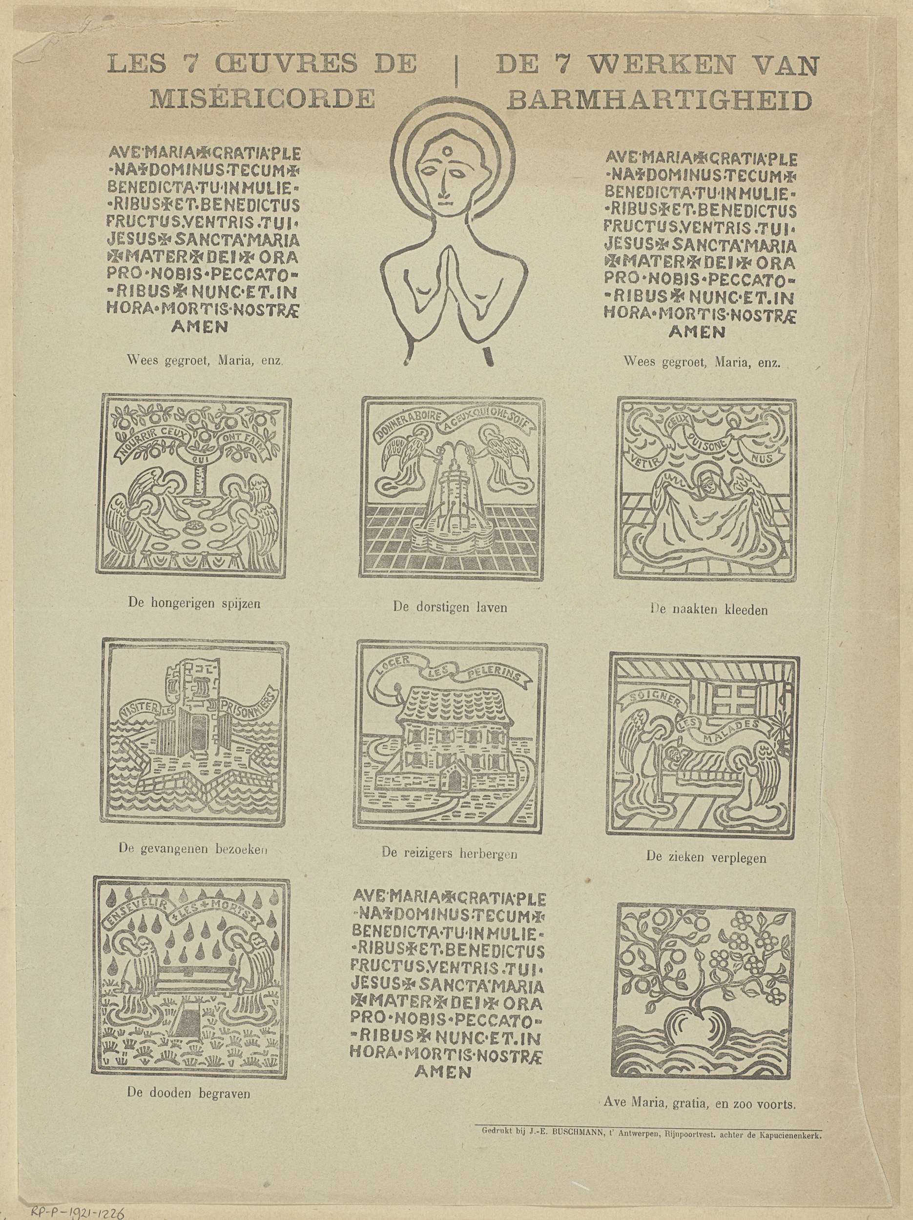 Blad met 9 voorstellingen. Zeven voorstellingen van de werken van barmhartigheid, een voorstelling van een figuur met een nimbus en een voorstelling van een appel waar takken met bloemen en vruchten uit groeien. Tussen de voorstellingen drie keer het 'Wees gegroet'. Onder elke voorstelling een titel in boekdruk.