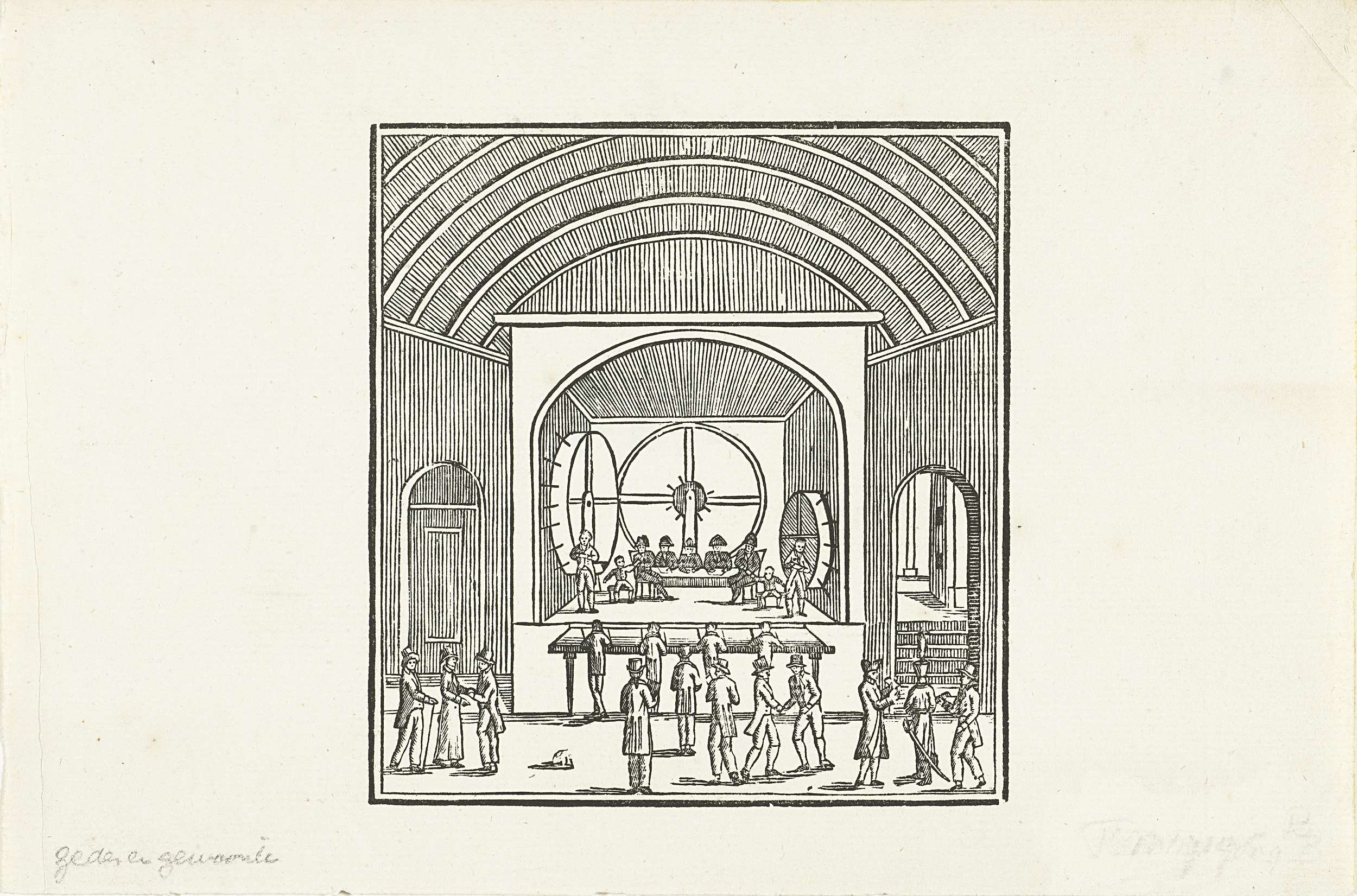 Het trekken van de loten tijdens een loterij, ca. 1750. Op een podium trekken twee kinderen de loten uit raderen in de loterijzaal in het Hof te Den Haag.