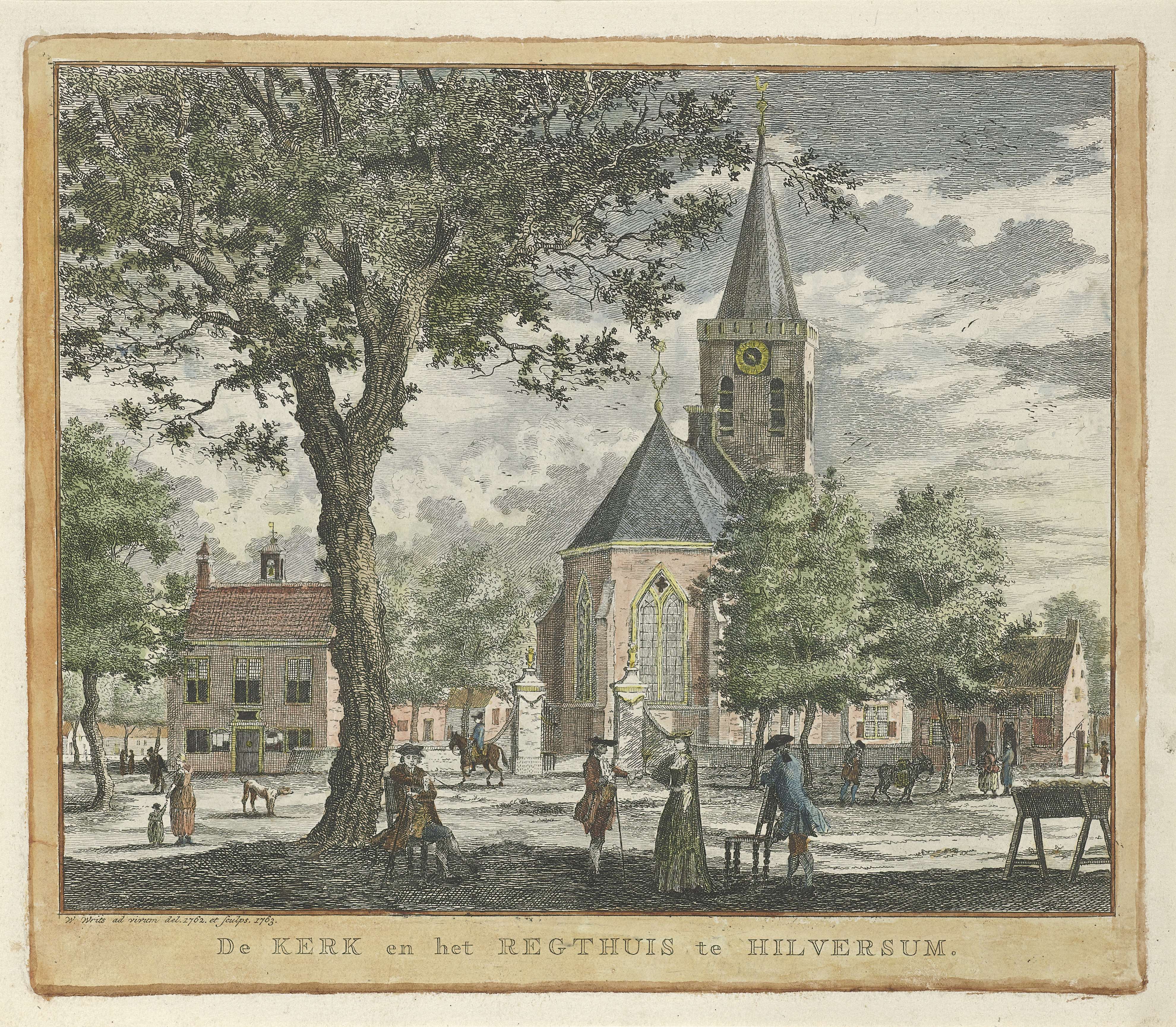 Gezicht op de Kerk en het Rechthuis te Hilversum in 1762, situatie vóór de brand van 25 juni 1766.