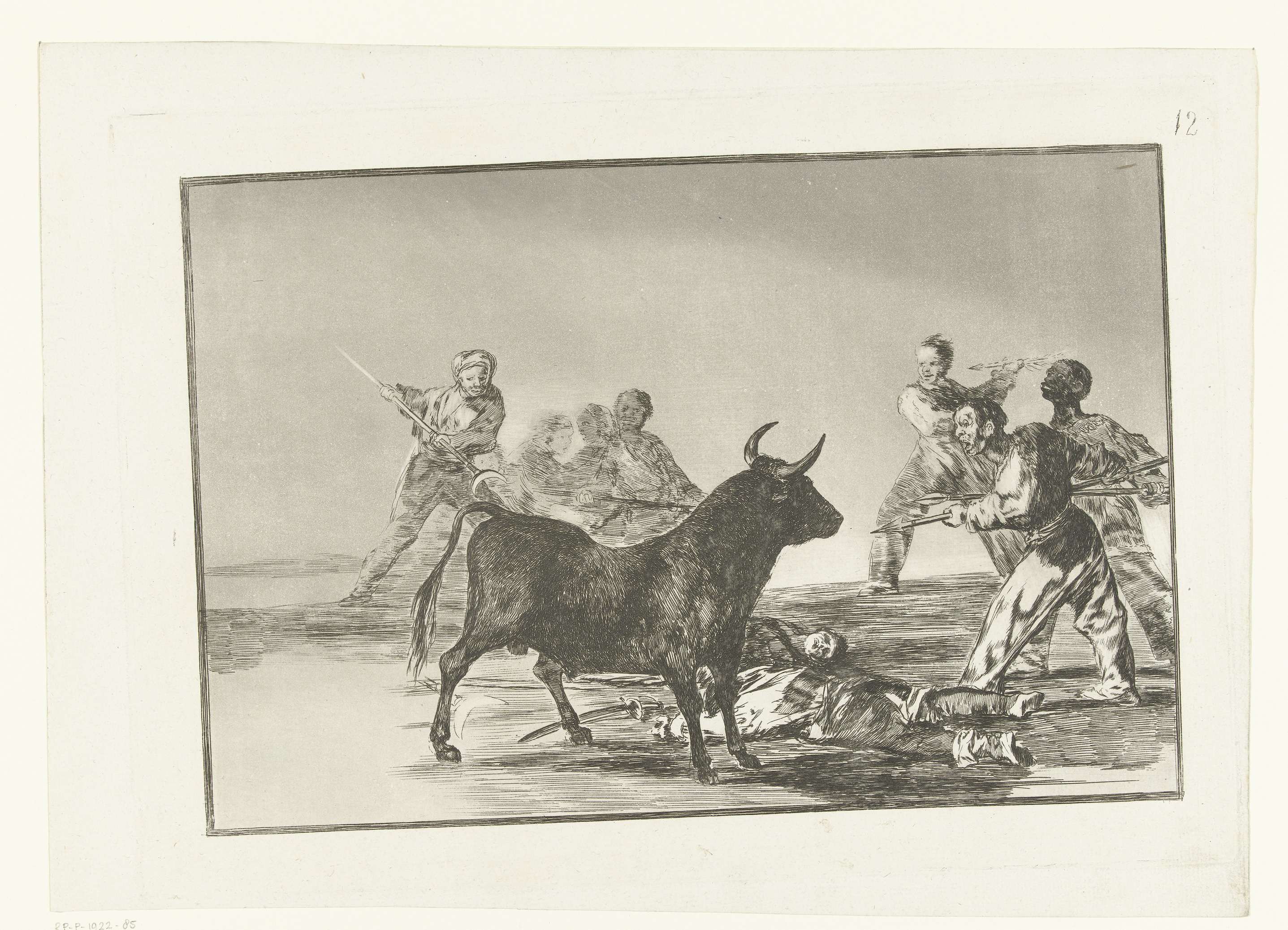 Een groep mannen valt een stier aan met lansen, een sikkel aan een stok en een baderilla. Op de grond liggen twee gewonde mannen.