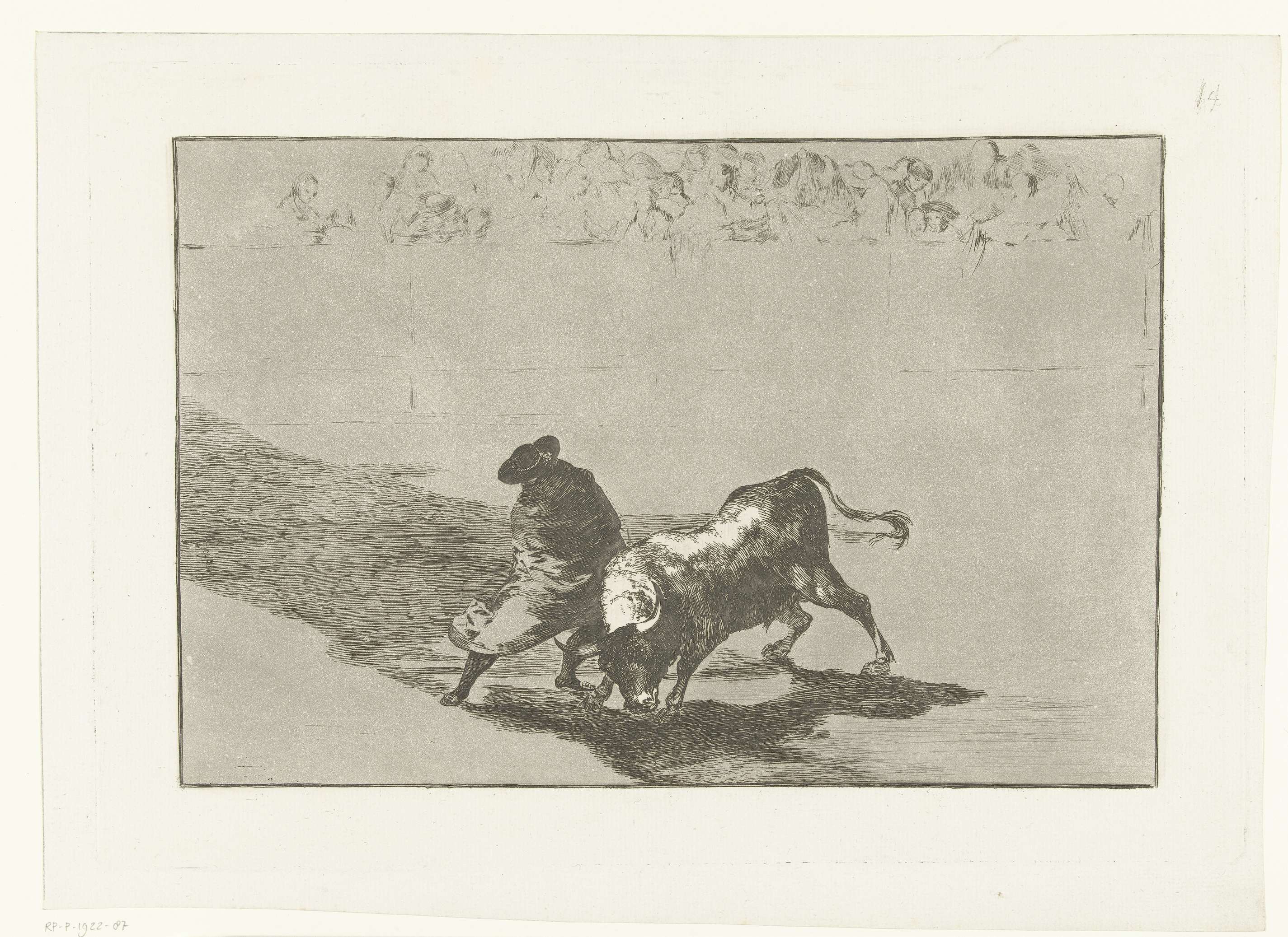 Een torero (stierenvechter) gewikkeld in een cape en in gevecht met een stier. Volgens de titel betreft het een student van Falces, een legendarische stierenvechter. Op de tribune een groep toeschouwers.