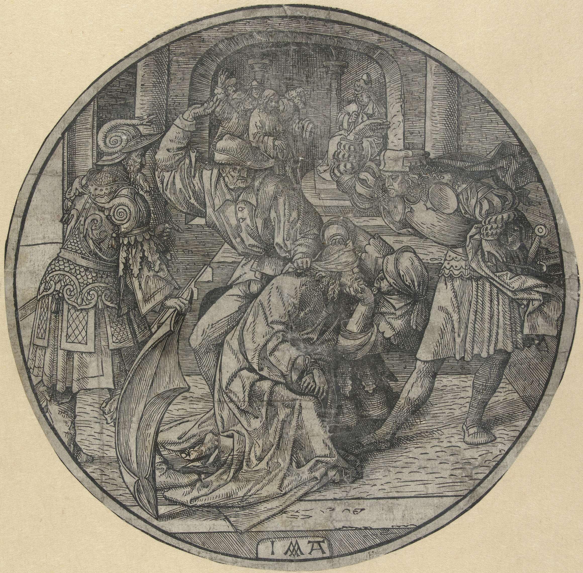 Uit serie van twaalf prenten. Omlijsting weggesneden. Christus, geboeid en geblindoekt, geslagen en bespot door vier mannen. Op achtergrond Christus voor Pilatus.