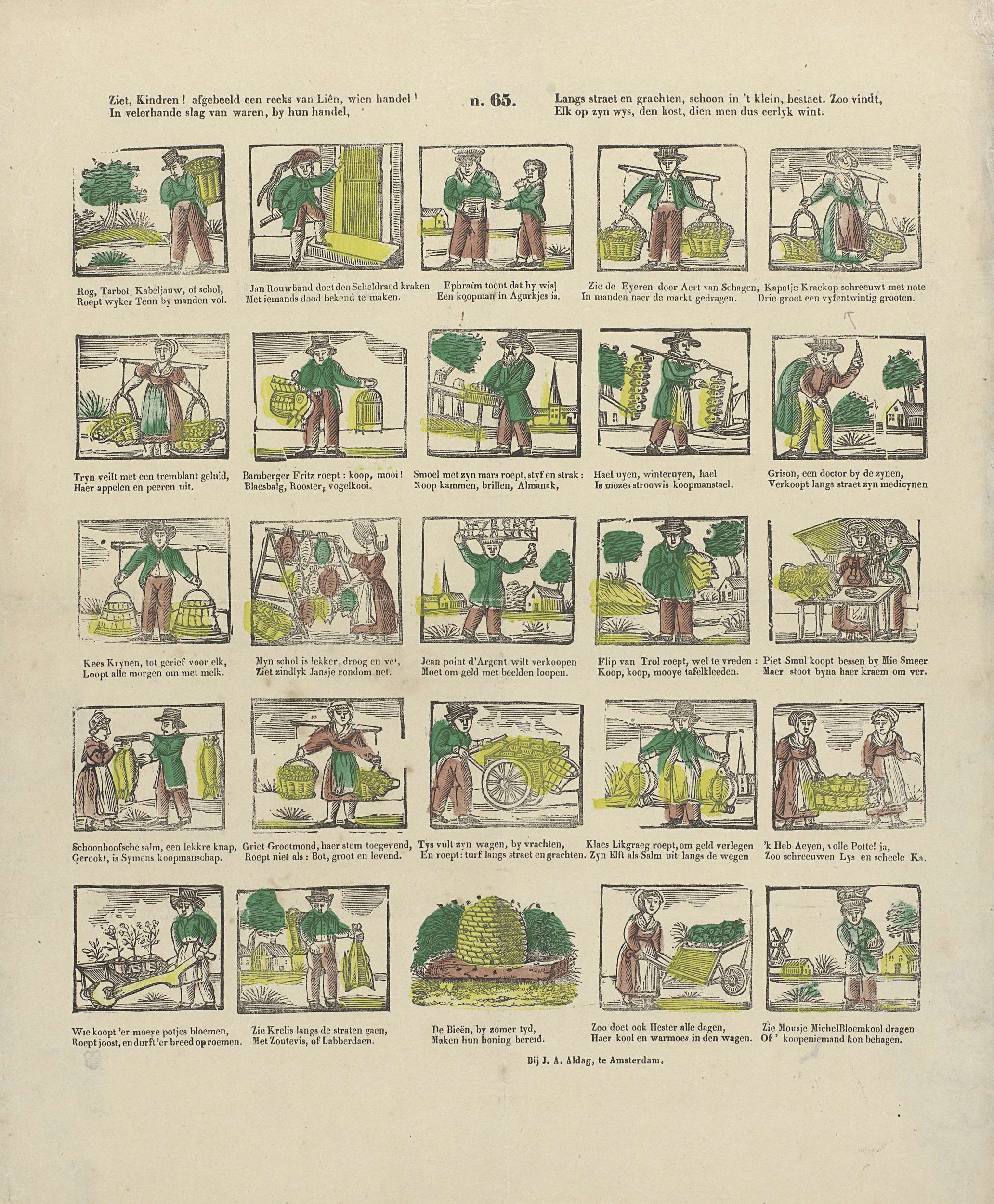 Ziet, Kindren ! afgebeeld een reeks van Liên, wien handel / In velerhande slag van waren, by hun handel, / Langs straet en grachten, schoon in 't klein, bestaet. Zoo vindt, / Elk op zyn wys, den kost, dien men dus eerlyk wint