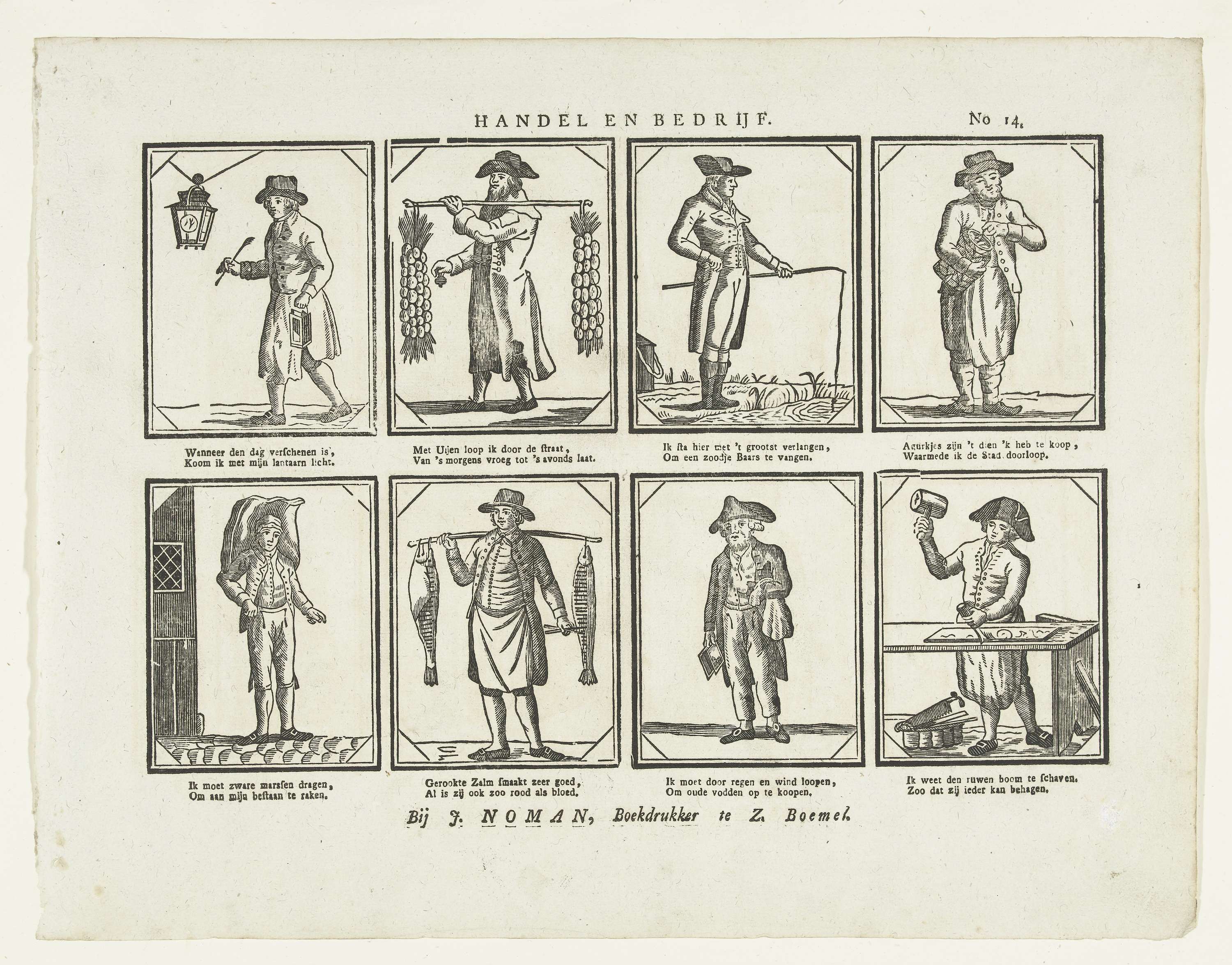 Blad met 8 voorstellingen van ambachtslieden en beroepen, zoals straatverkoper en houtbewerker. Onder elke afbeelding een tweeregelig vers. Genummerd rechtsboven: No 14.