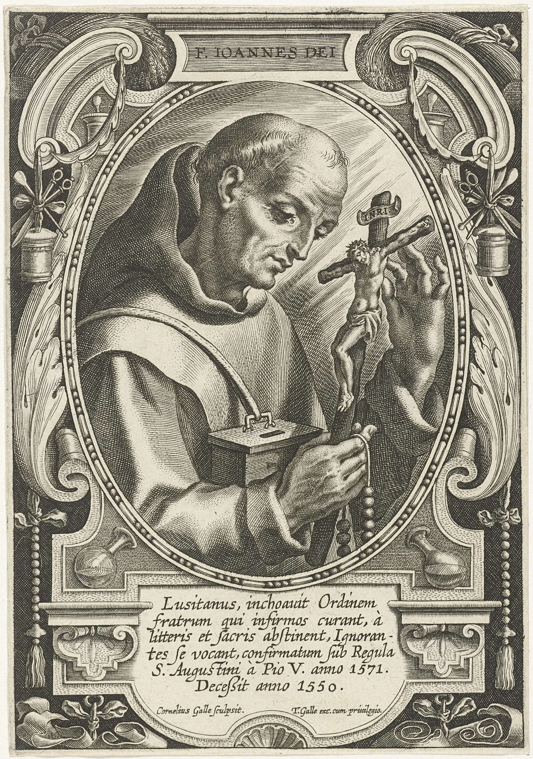 De heilige Johannes de Deo met crucifix en collectebus. Hij was de stichter van de Orde van de Broeders van Barmhartigheid. Deel van een serie van afbeeldingen van de bekendste stichters van de kloosterorden.