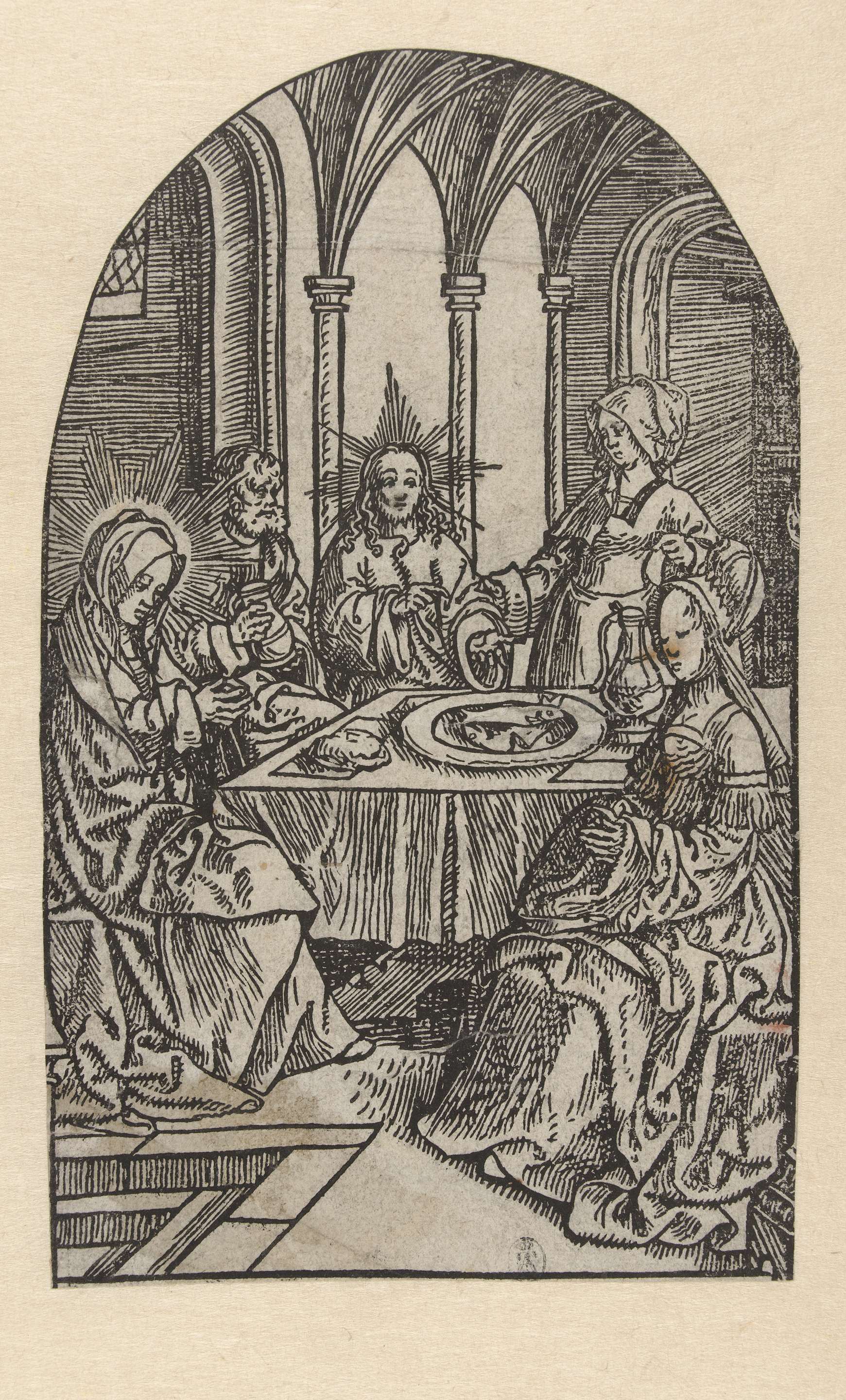 Fragment van een prent met vier voorstellingen, uit een serie van zeven. Christus rond tafel met zijn moeder, een discipel, Martha, en Maria met gevouwen handen.