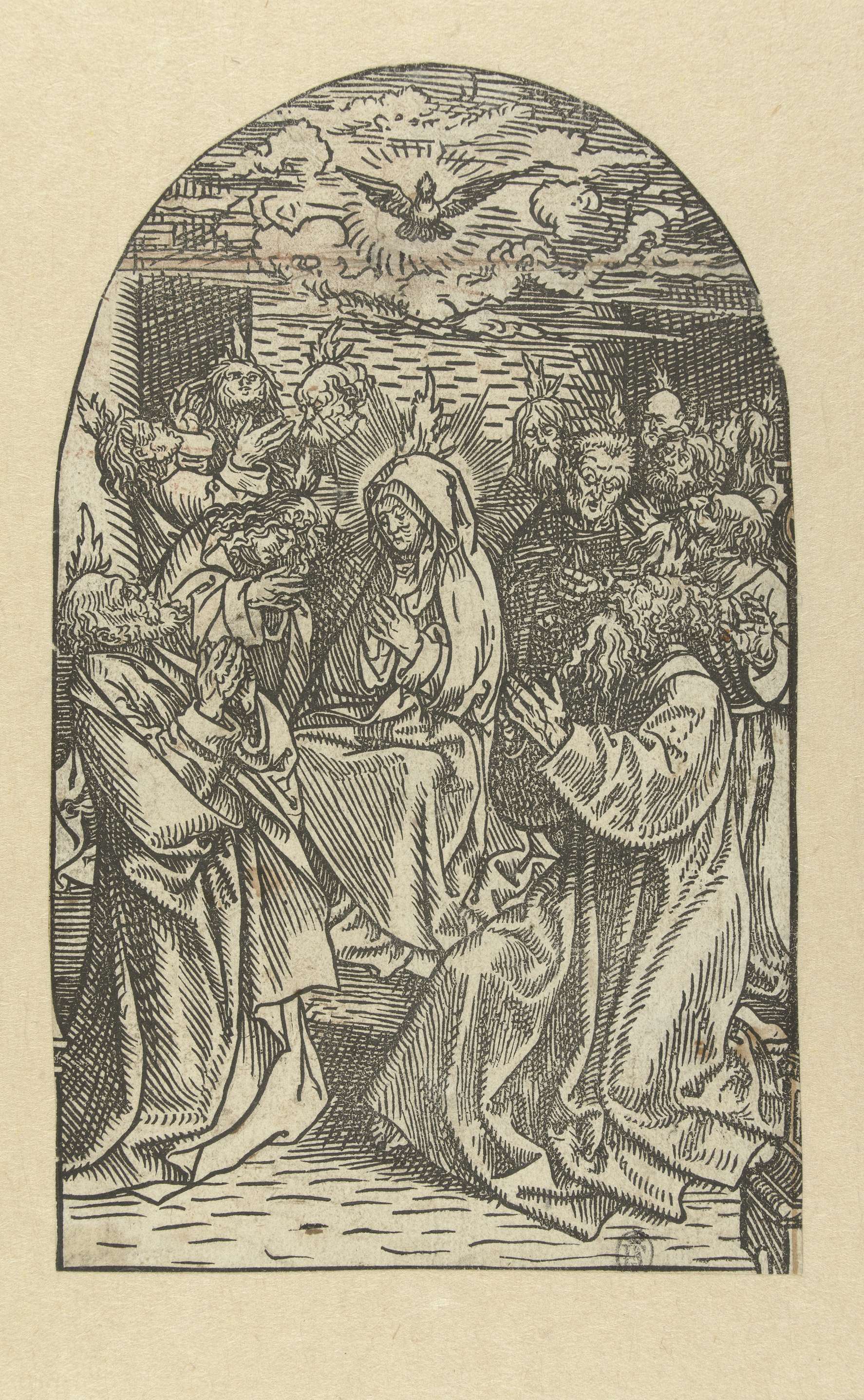 Fragment van een prent met vier voorstellingen, uit een serie van zeven. Maria omringd door twaalf apostelen met vlam boven hoofd. Heilige Geest in wolk boven hen.