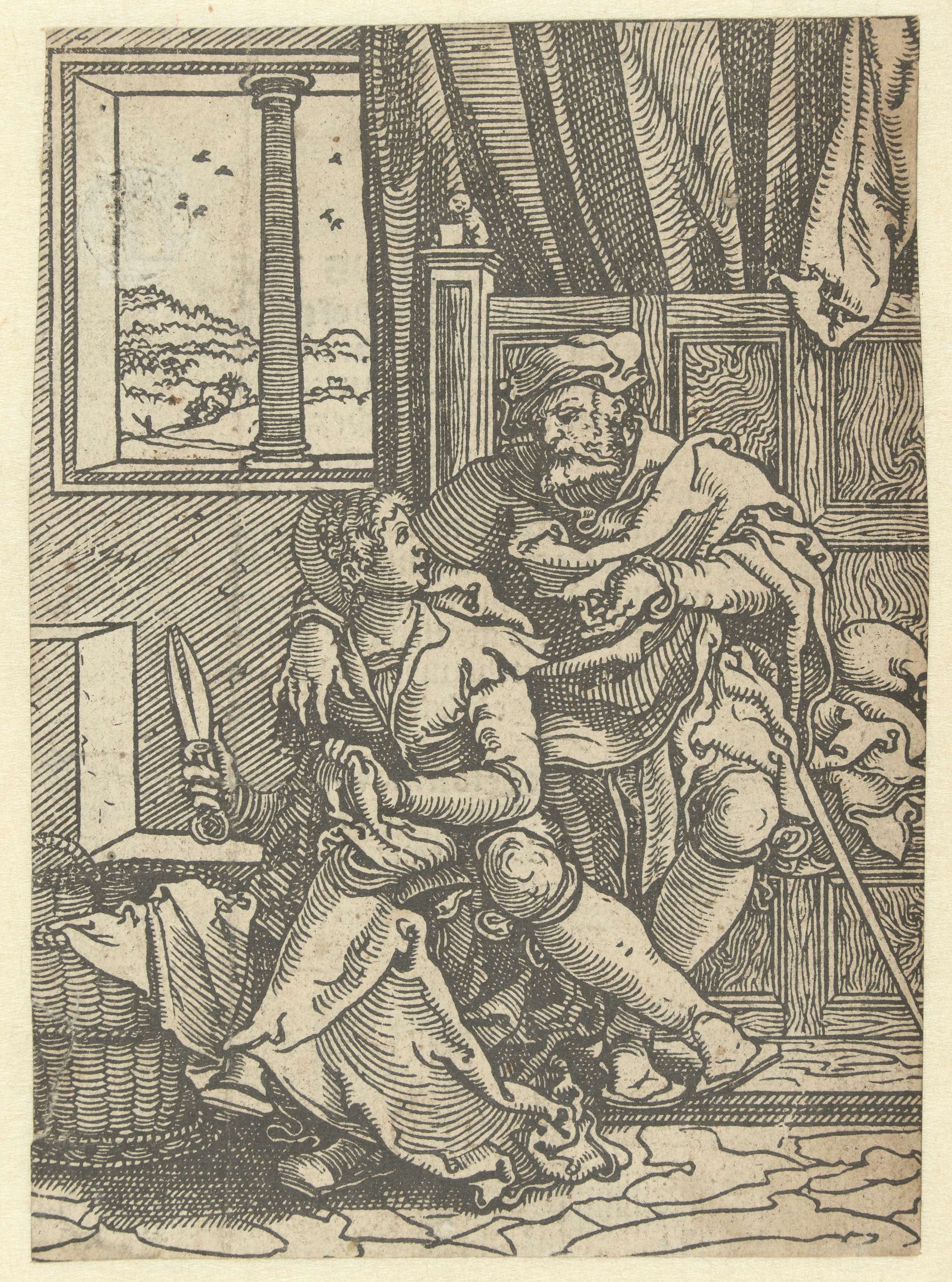 Titelpagina van een traktaat over de naaikunst. Kamer met vrouw zittend met schaar en stuk stof in handen, achter haar zit man.