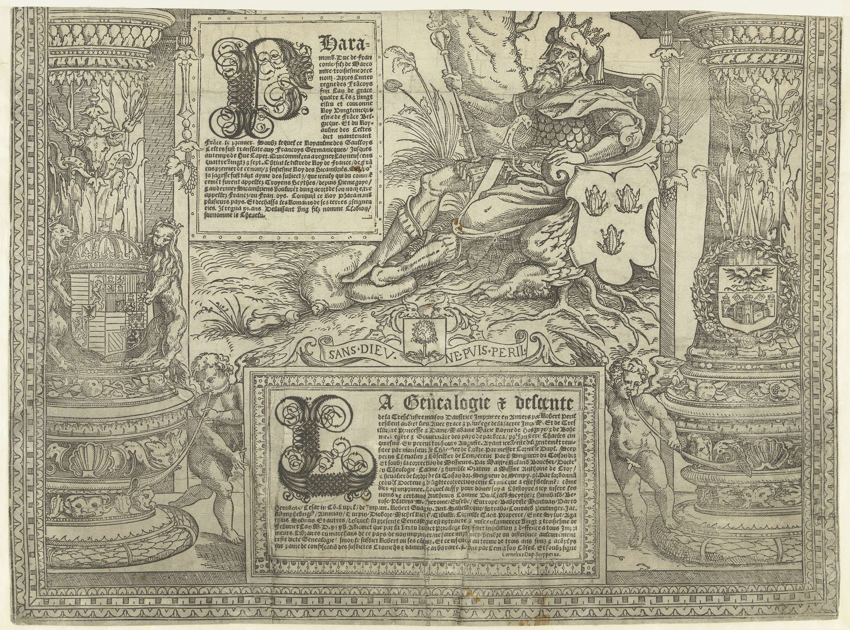 Eerste blad van twintig, vormen samen een stamboom. Begin van de stamboom van het Habsburgse huis met Pharamond, koning der Franken, zittend bij de wortel van de boom. Twee cartouches met teksten in het Frans, en het devies van de prentmaker "Sans Dieu ne puis peril".