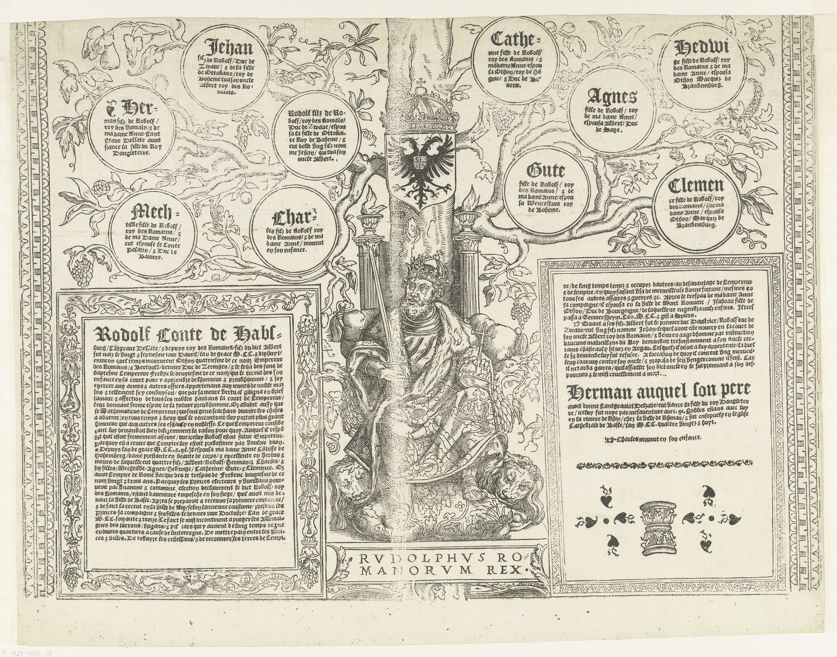 Eén blad van twintig, vormen samen een stamboom. In de boom op een troon Rudolf I van Habsburg, keizer van het Heilige Roomse Rijk. Tien kleine medaillons met namen van familieleden. Twee cartouches met teksten in het Frans.