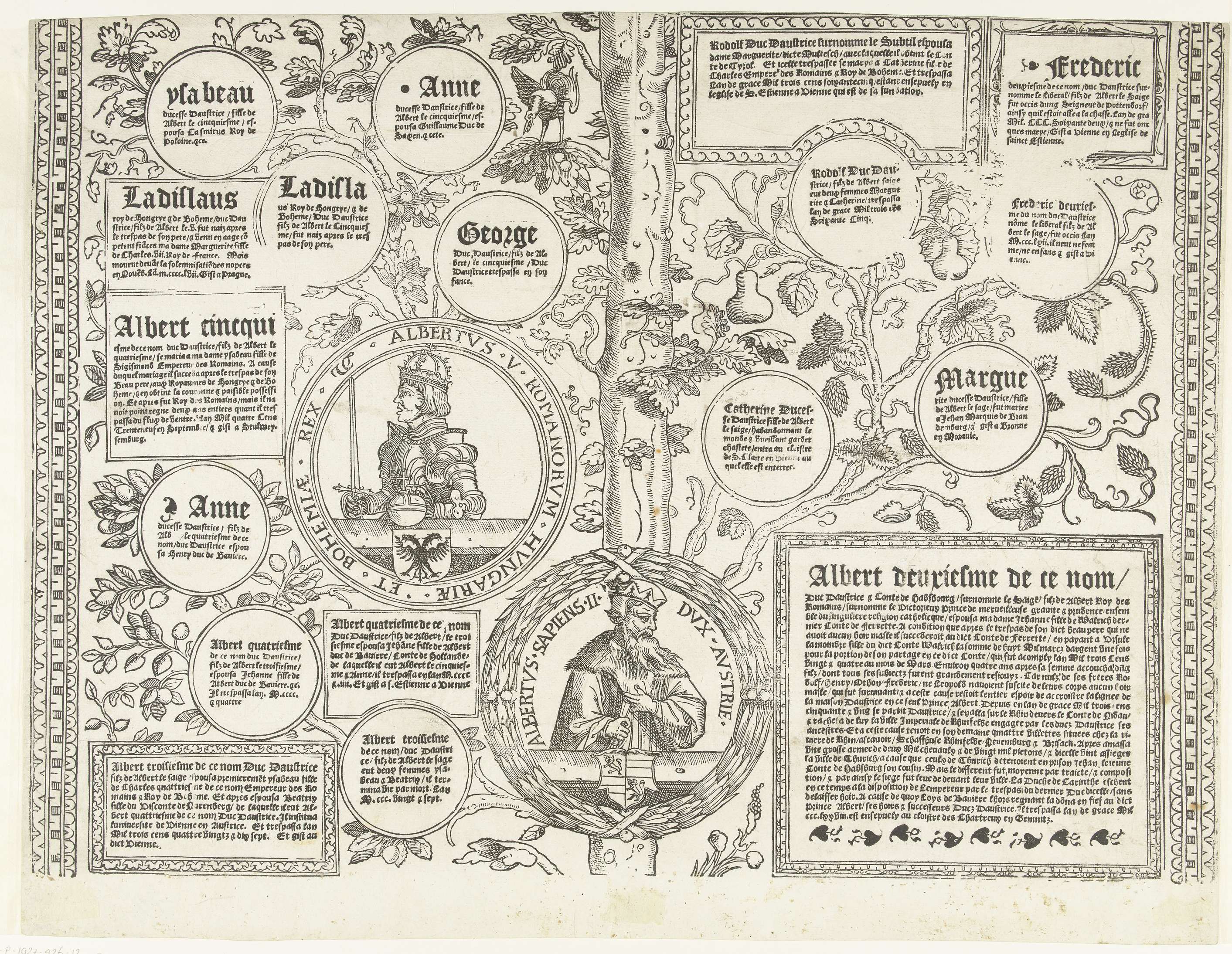 Eén blad van twintig, vormen samen een stamboom. In de boom twee medaillons met Albrecht II, hertog van Oostenrijk en Albrecht V (II) koning van het Heilige Roomse Rijk. Elf kleine medaillons met namen van familieleden en zeven cartouches met teksten in het Frans.