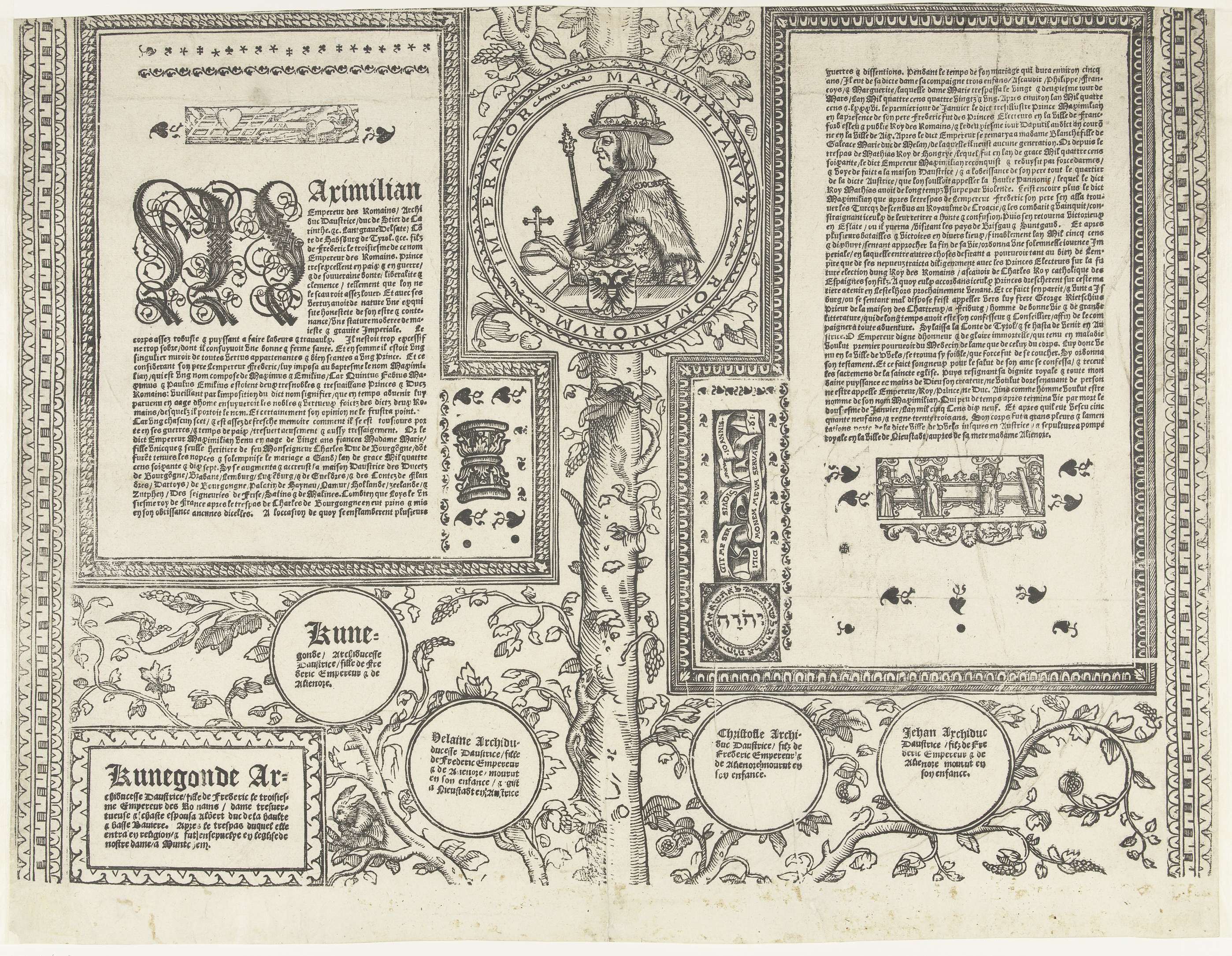 Eén blad van twintig, vormen samen een stamboom. In de boom medaillon met Maximiliaan I, keizer van het Heilige Roomse Rijk. Vier kleine medaillons met namen van familieleden en drie cartouches met teksten in het Frans.