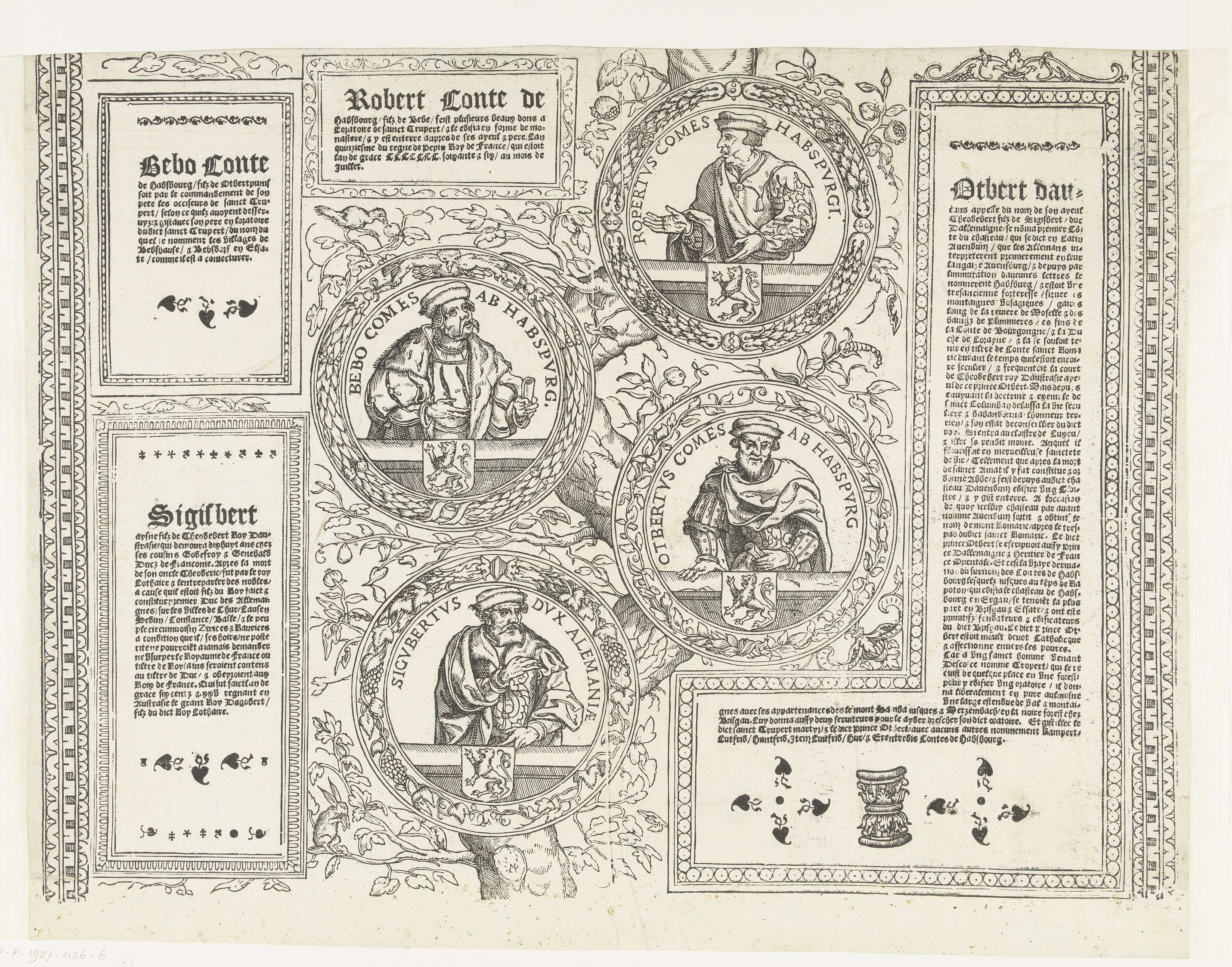 Eén blad van twintig, vormen samen een stamboom. In de boom vier medaillons met Sigibert II en de drie graven van Habsburg: Othbert, Bebo en Robert. Vier cartouches met tekst in het Frans.