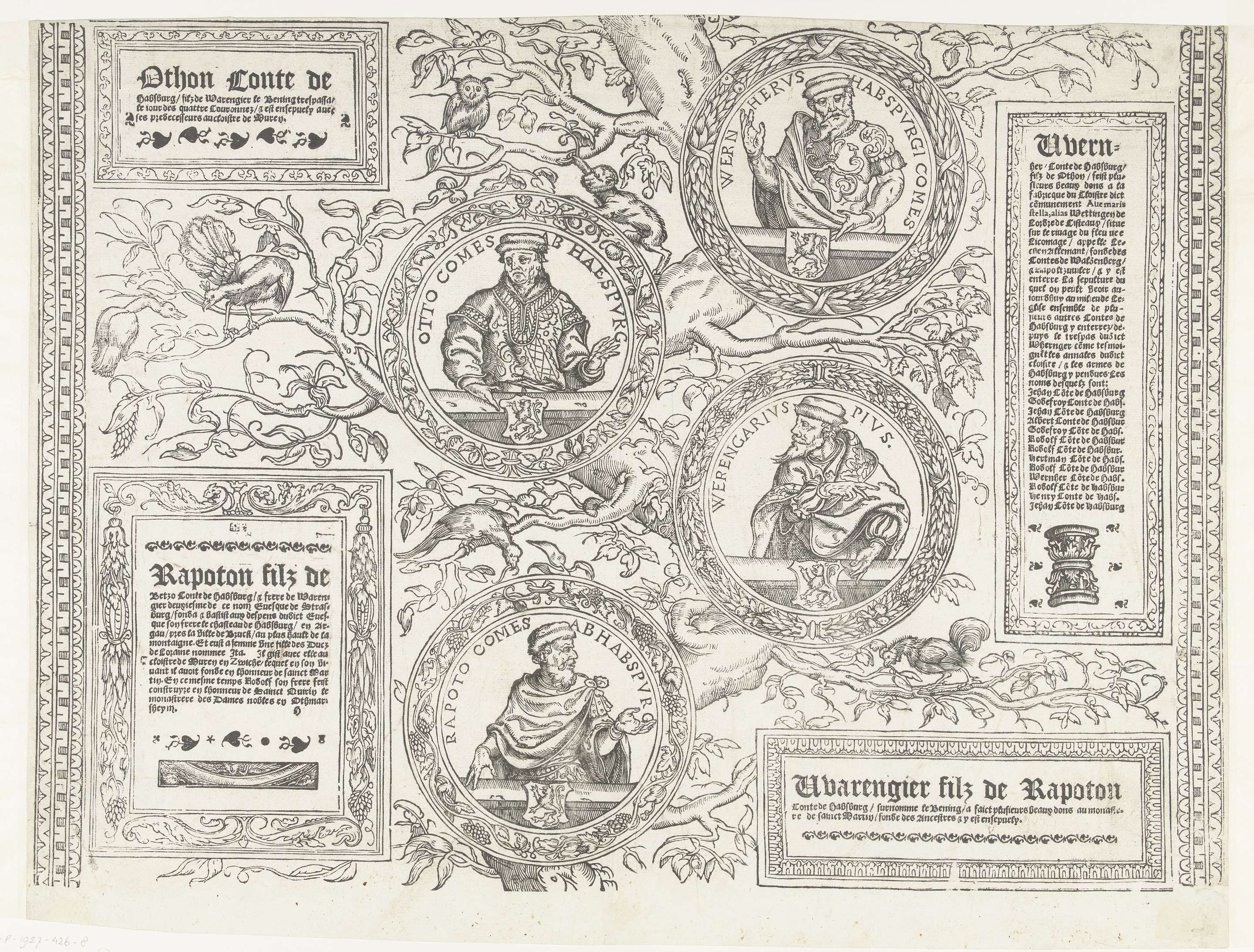 Eén blad van twintig, vormen samen een stamboom. In de boom vier medaillons met fgraven van Habsburg: Radbot (Rapoto), Werner I, Otto II en Werner II. Vier cartouches met tekst over hen in het Frans.