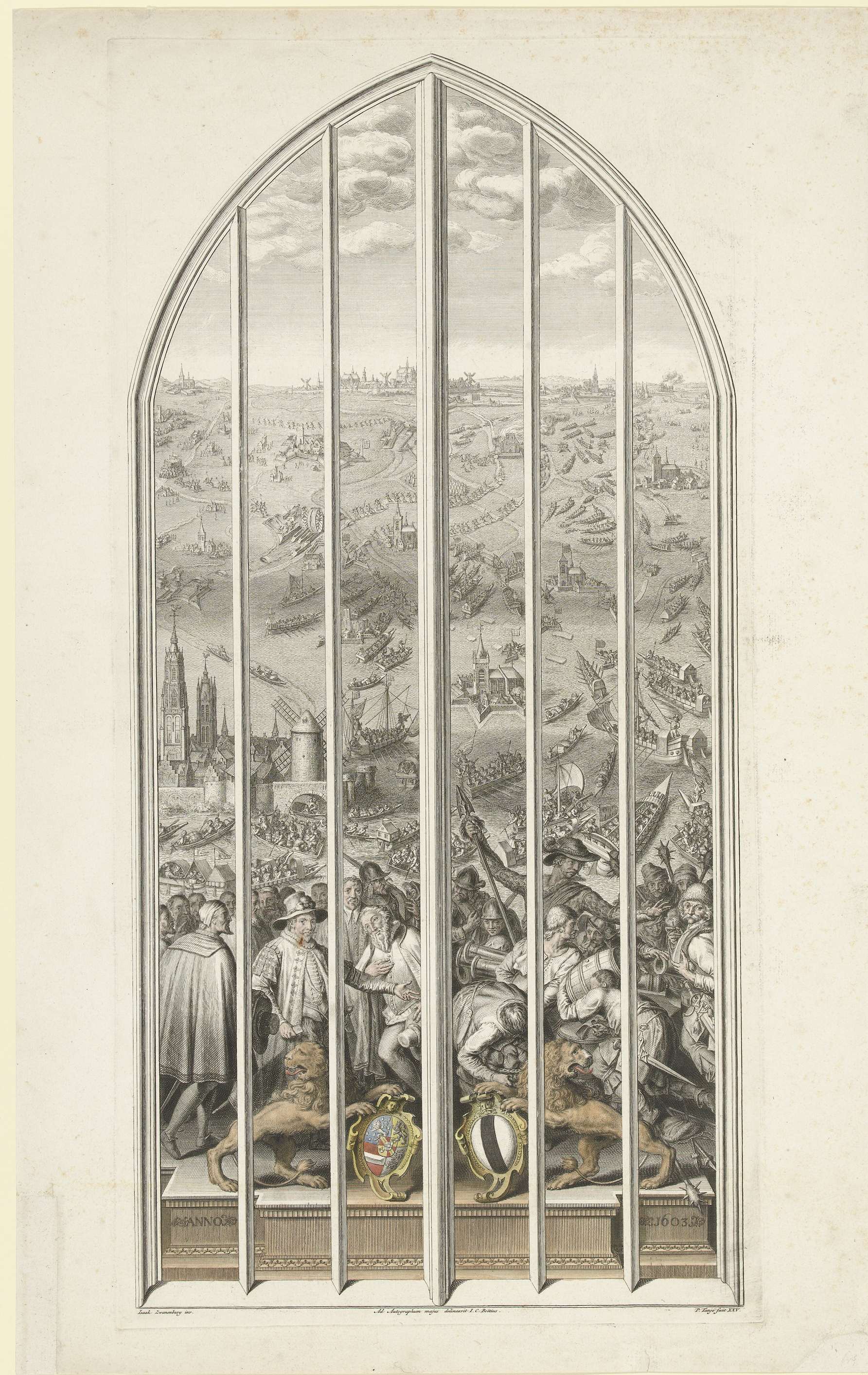 Glasraam 25 in de Sint-Janskerk te Gouda: Het ontzet van Leiden, 1574