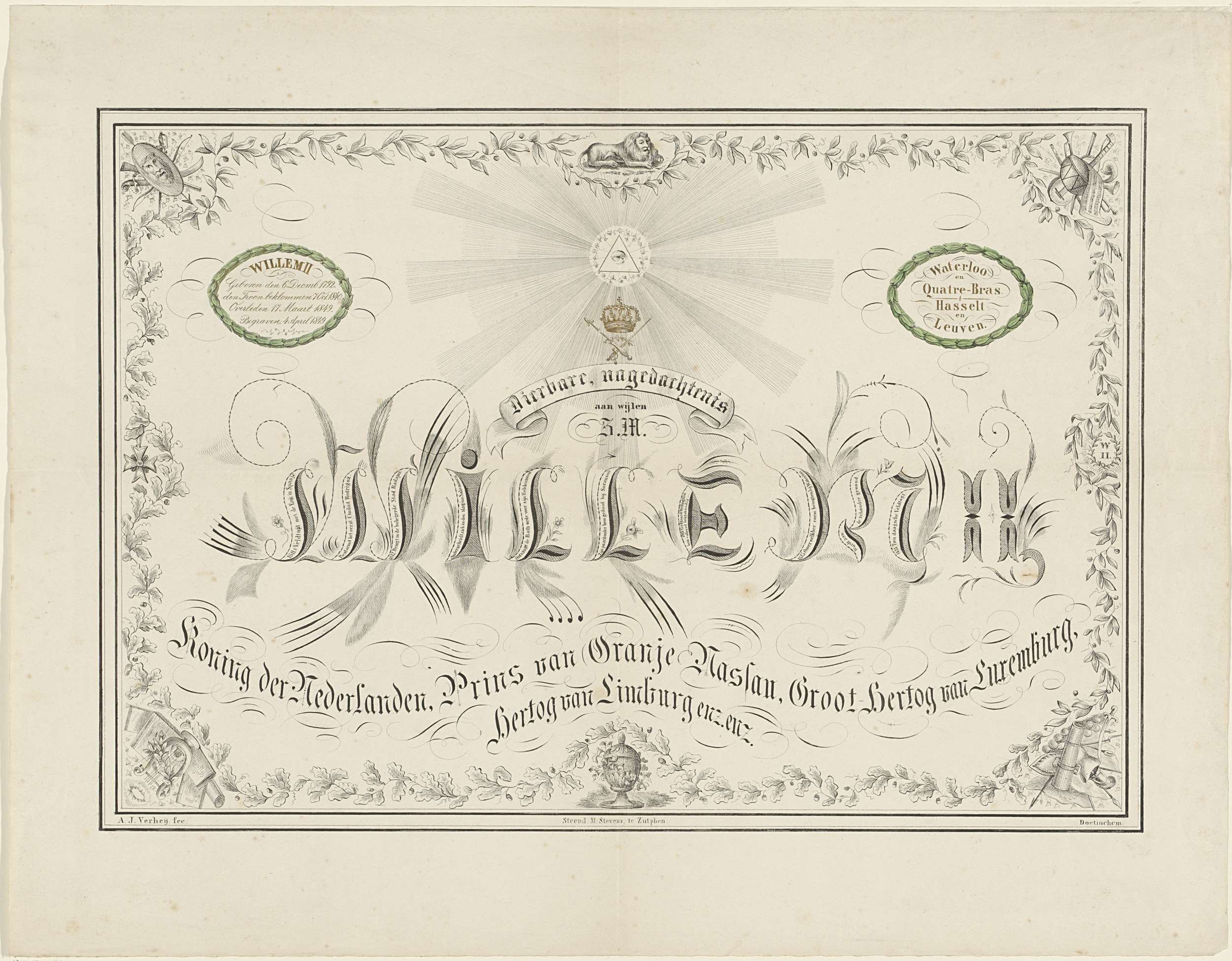 Nagedachtenis aan Willem II. Links zijn geboortedatum, de datum waarop hij koning werd, zijn sterfdatum en de datum waarop hij begraven werd in een ovaal. Rechts namen van veldslagen in een ovaal. In het midden zes regels Nederlandse tekst. Daar omheen een aantal allegorische objecten en figuren. Geheel in een geornamenteerde rechthoek met bladen.