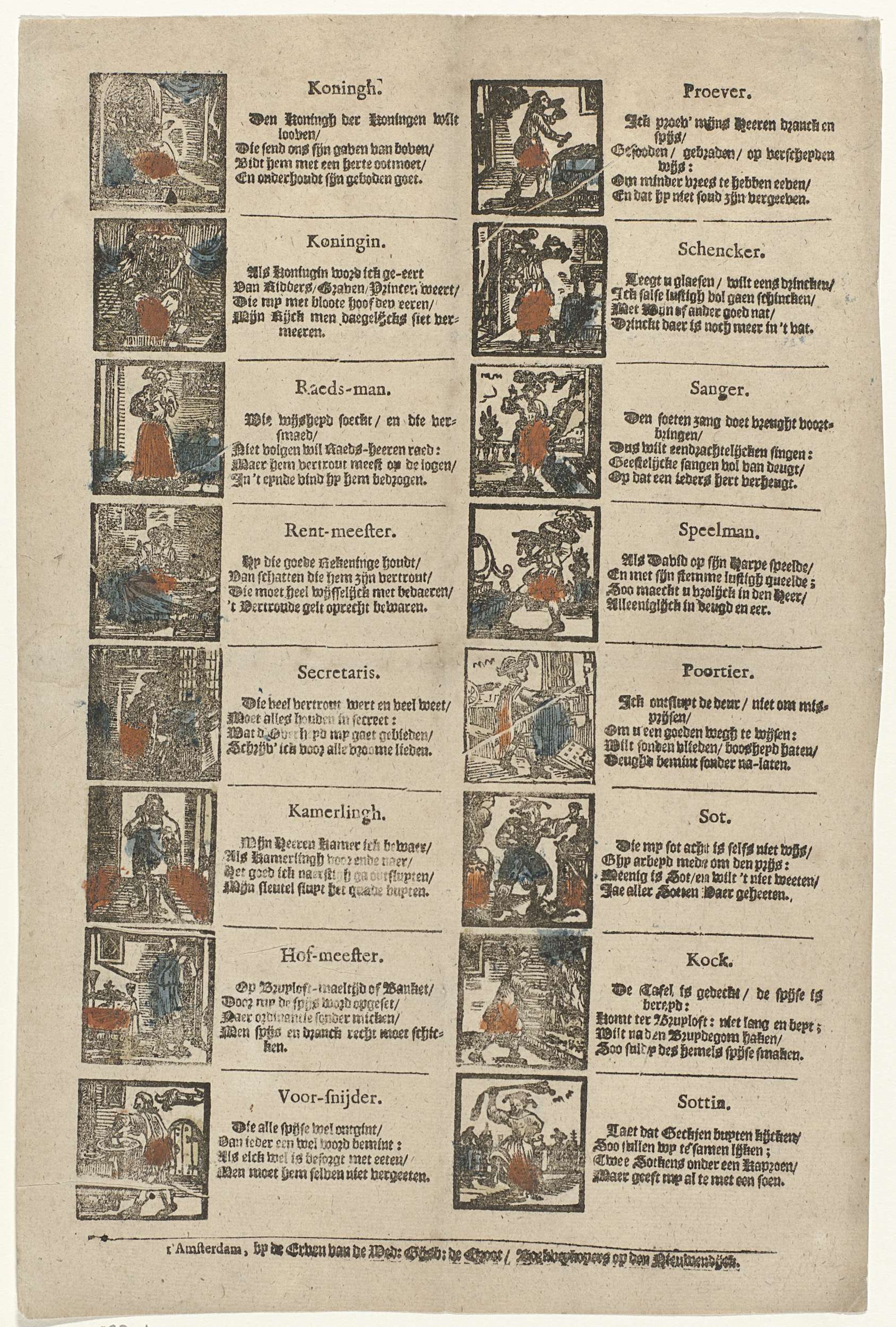 Blad met 16 voorstellingen (driekoningenbriefjes) van verschillende functies binnen het hof, waaronder een raadsman, een proever en een portier. Rechts naast elke afbeelding een vierregelig vers.