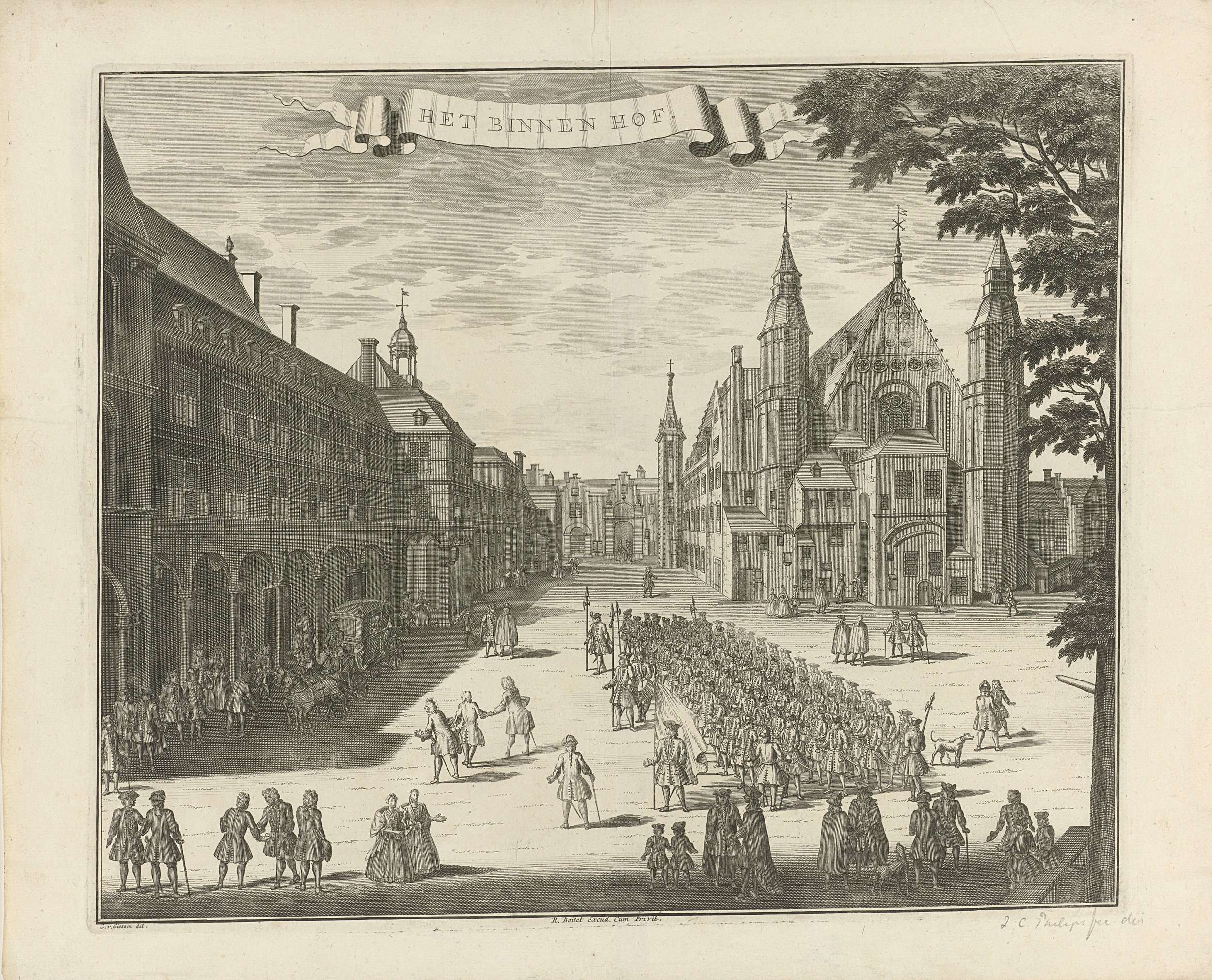 Gezicht op het Binnenhof te Den Haag, met op het plein verschillende figuren.