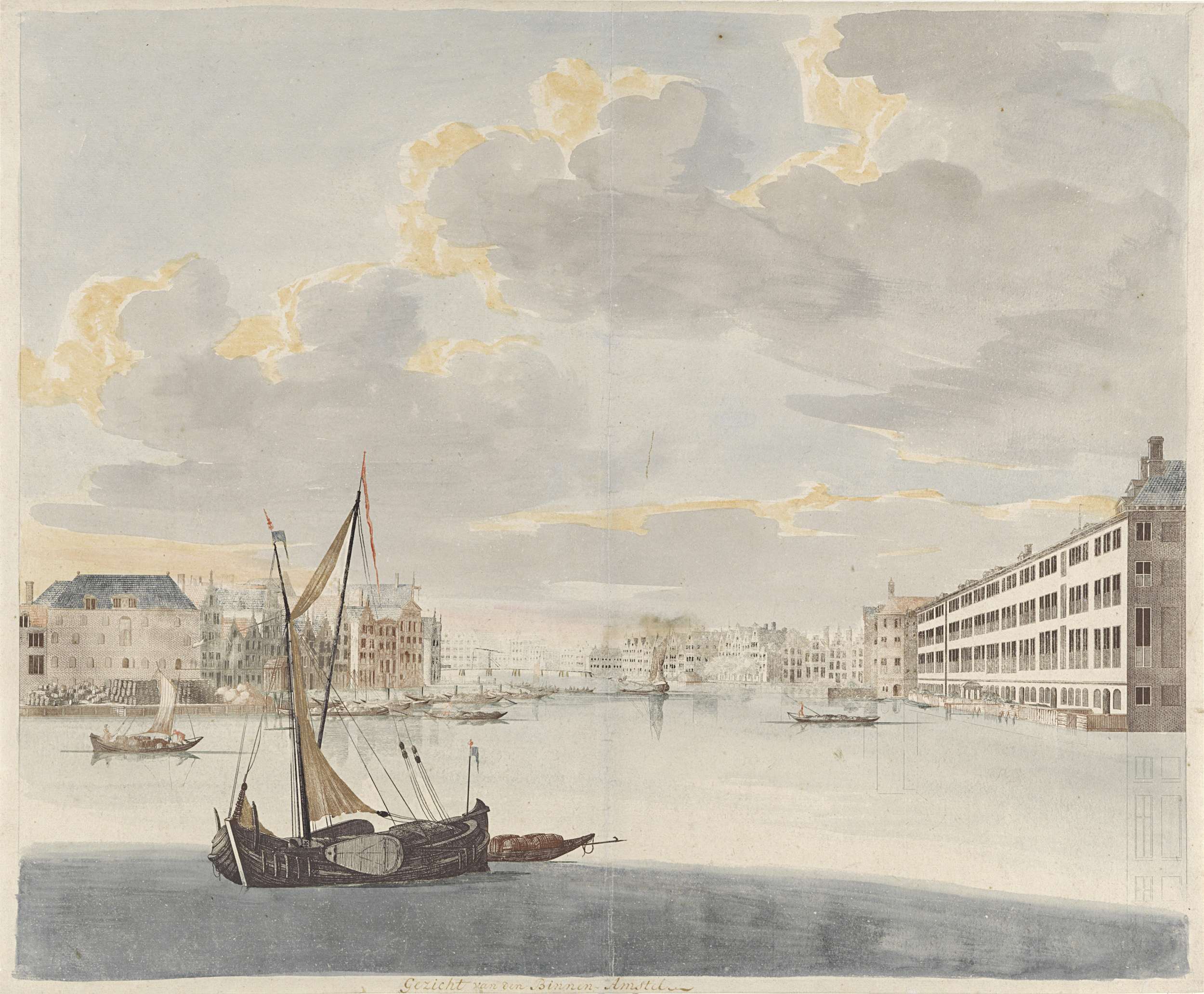 Verschillende schuiten en zeilschip op de voorgrond varen op de Binnen-Amstel in Amsterdam.