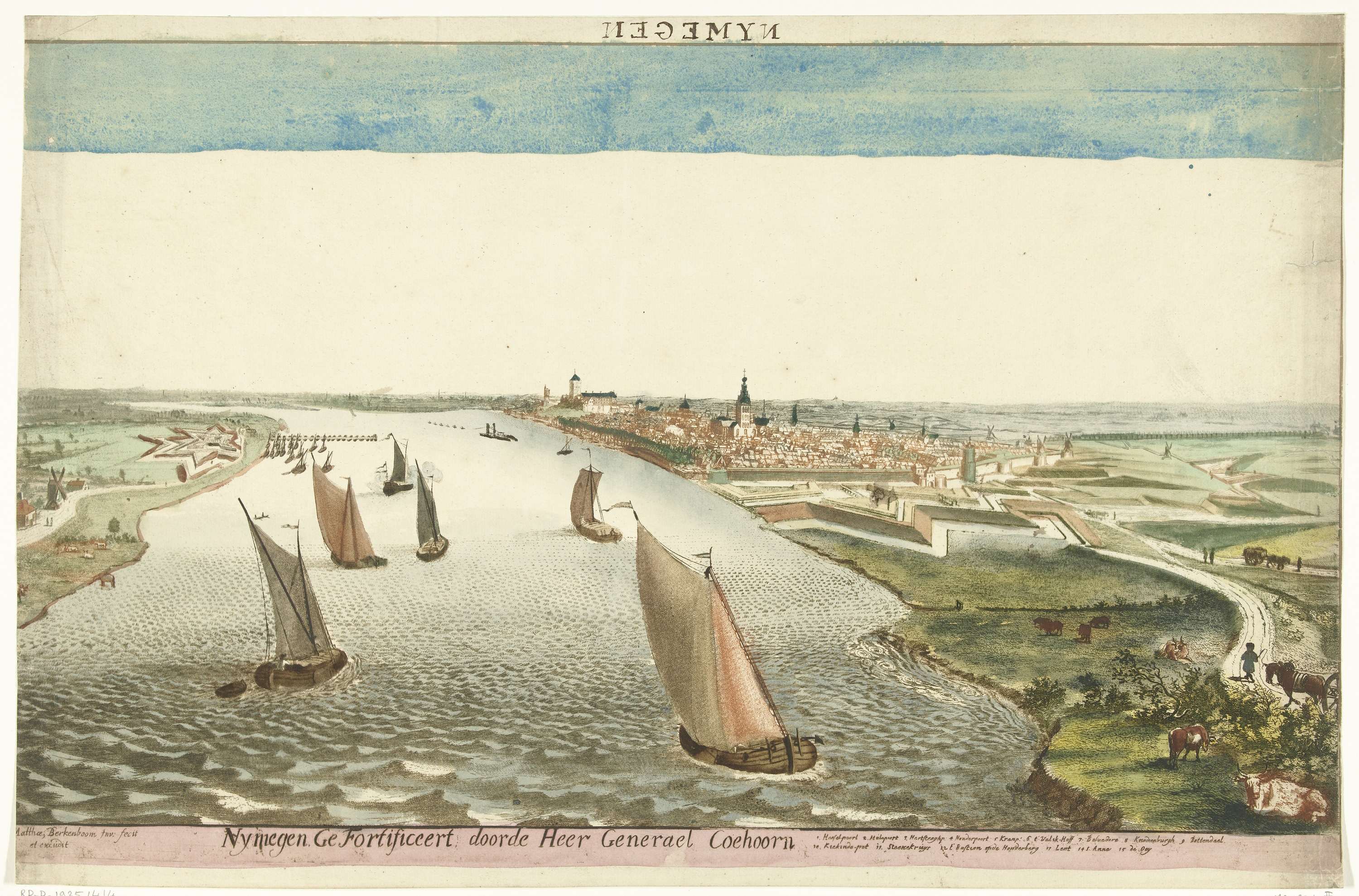 Gezicht op de Waal en Nijmegen met zijn versterkingen. Op de rivier varen zeilschepen. Rechts onder een legenda van 1-15.