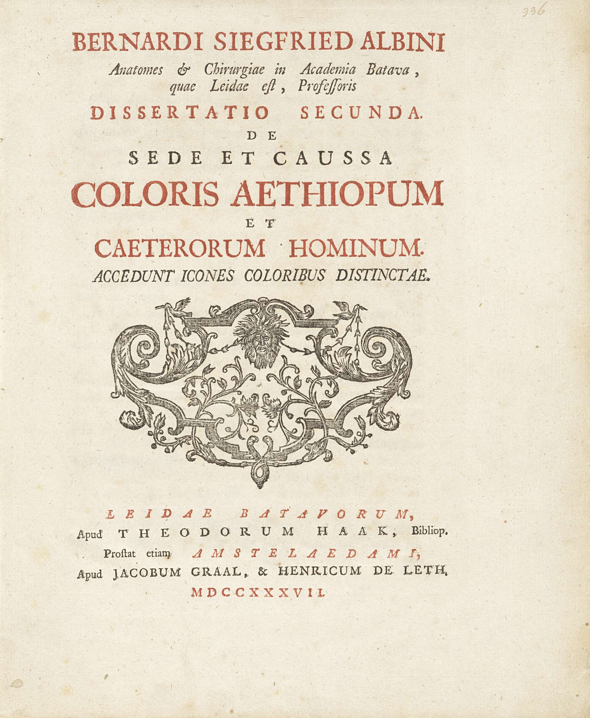 Titelpagina en twee pagina's van Bernhard Siegfried Albinus' 'Dissertatio secunda de sede et caussa Coloris Aethiopum', 1737