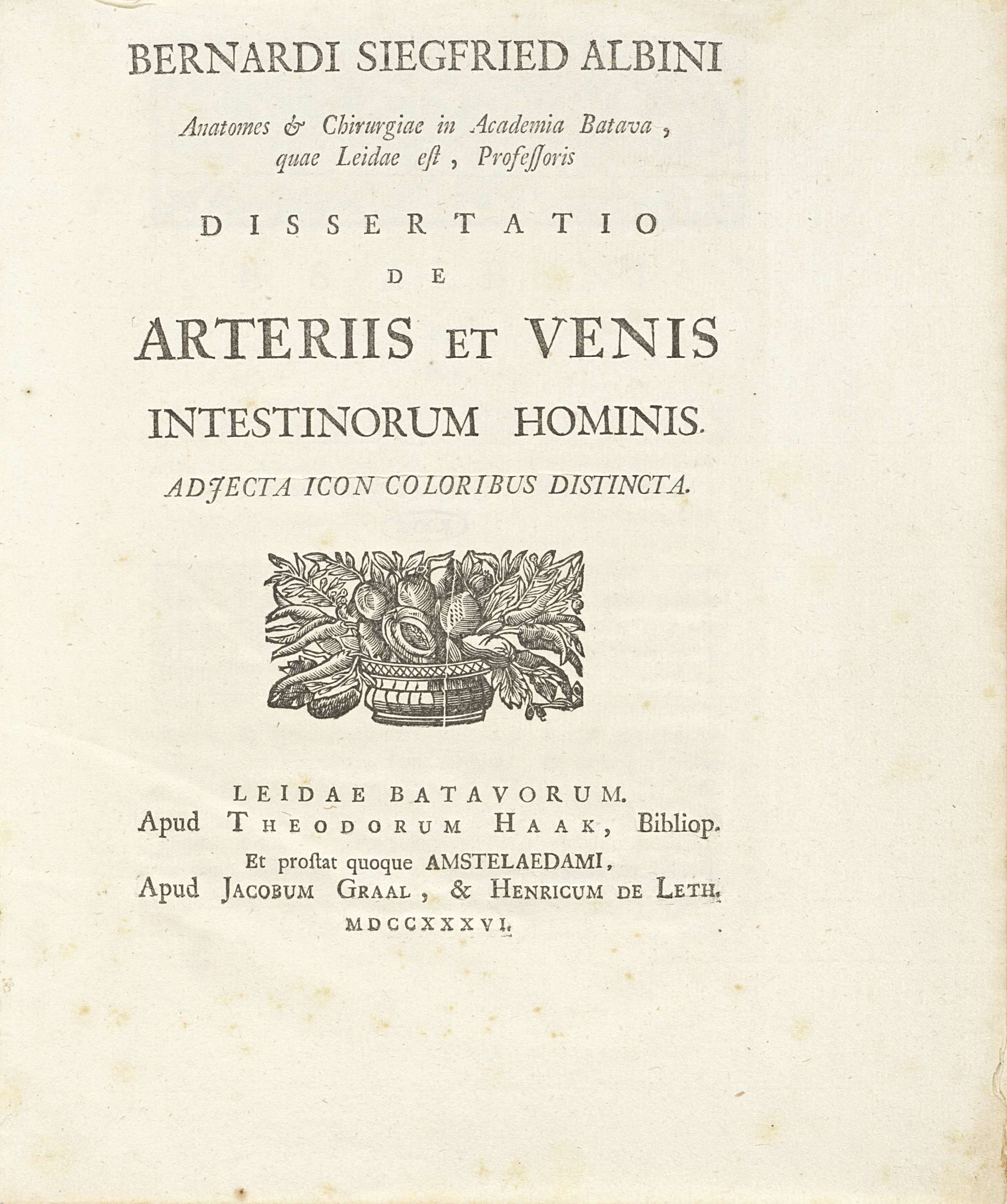 Titelpagina van Bernhard Siegfried Albinus' 'Dissertatio de arteriis et venis intestinorum hominis', 1736.