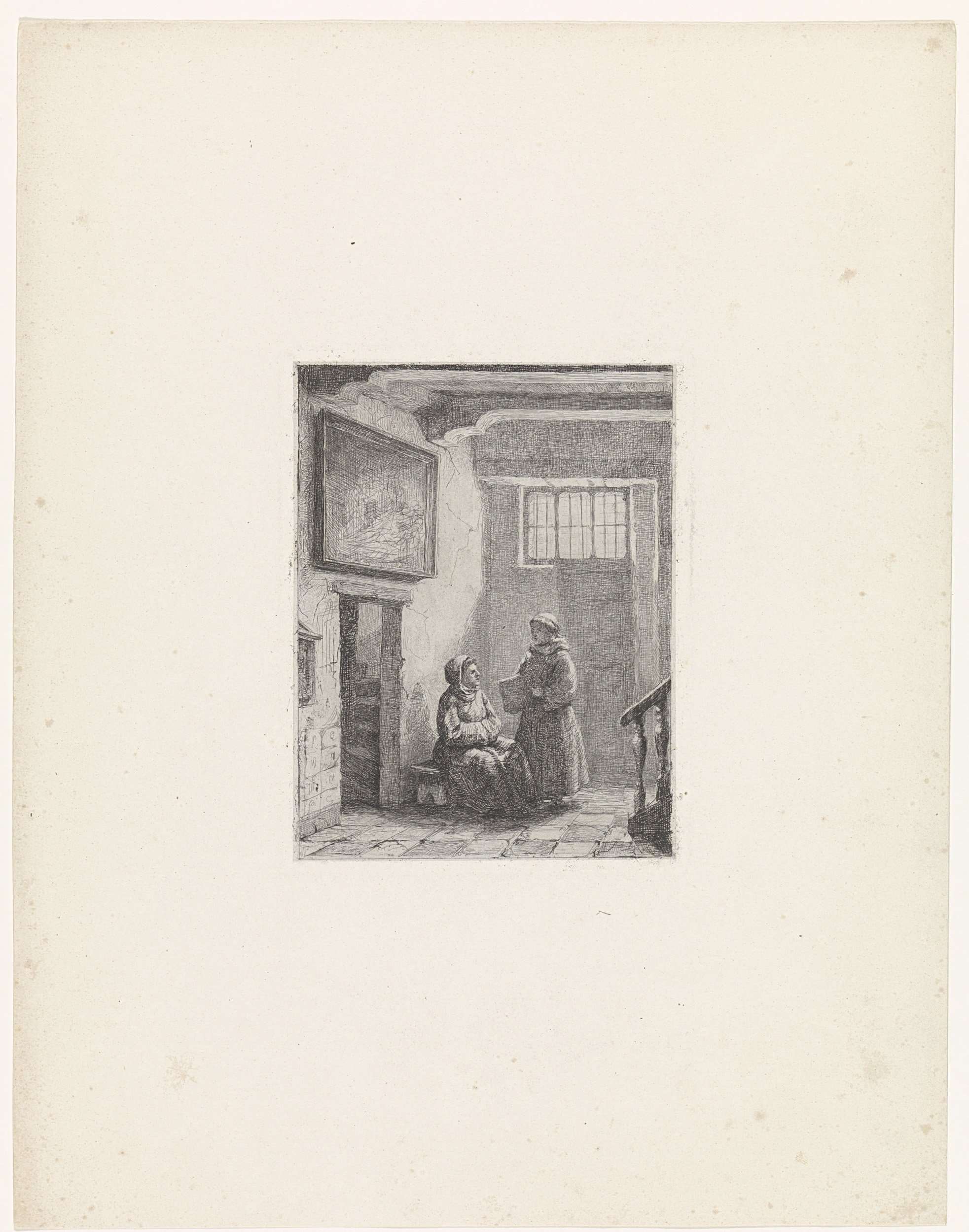 In een vertrek bevinden zich een zittende monnik en een staande monnik met een boek onder zijn arm. Boven de deur hangt een schilderij en rechts is een deel van een trap zichtbaar.