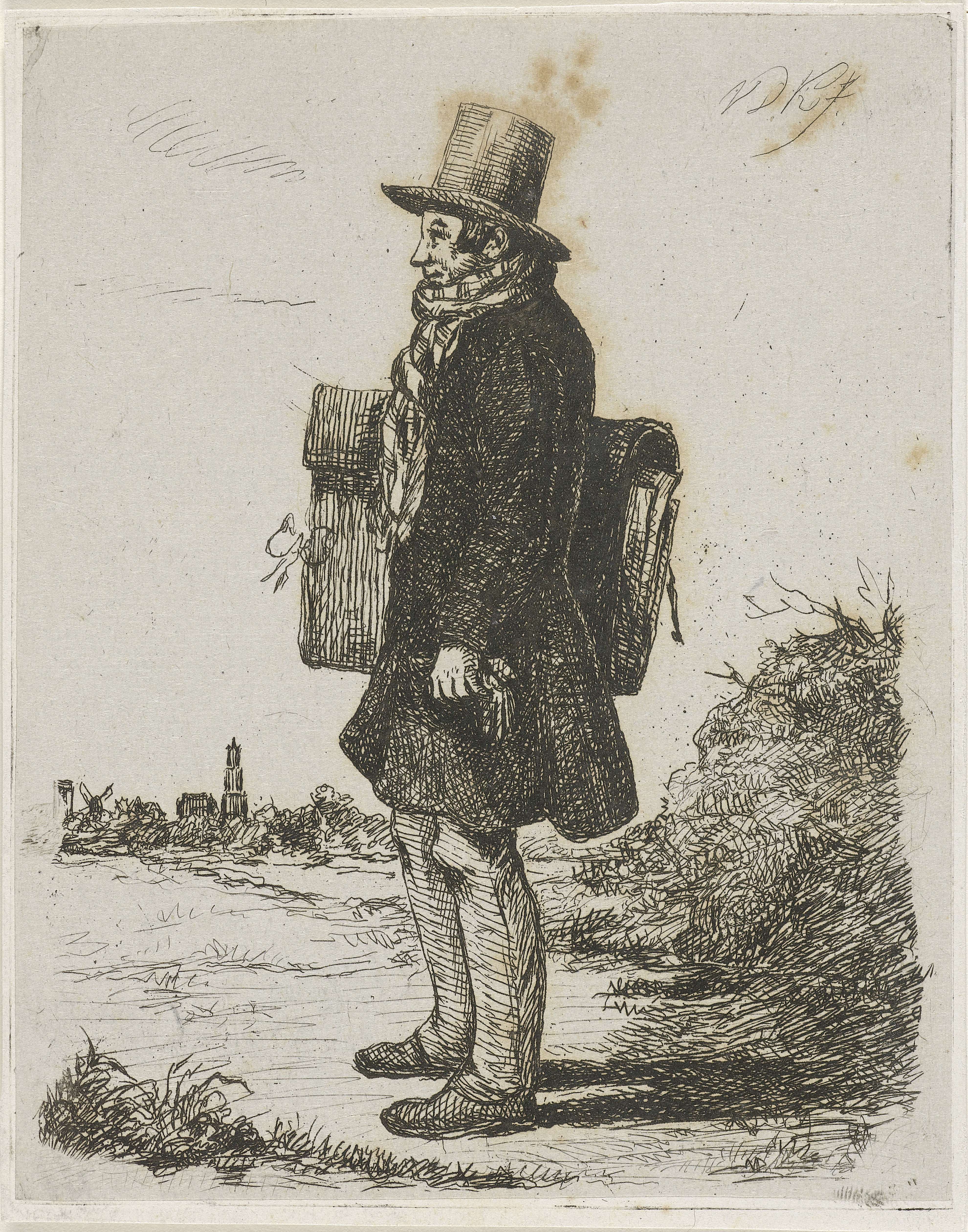 Portret van de schilder en prentmaker Hermanus Jan Hendrik Rijkelijkhuizen, staande in een landschap bij Utrecht, ten voeten uit. De schilder draagt een hoge hoed en een bouffante. Onder zijn arm heeft hij een portefeuille, en in zijn linkerhand een handschoen.