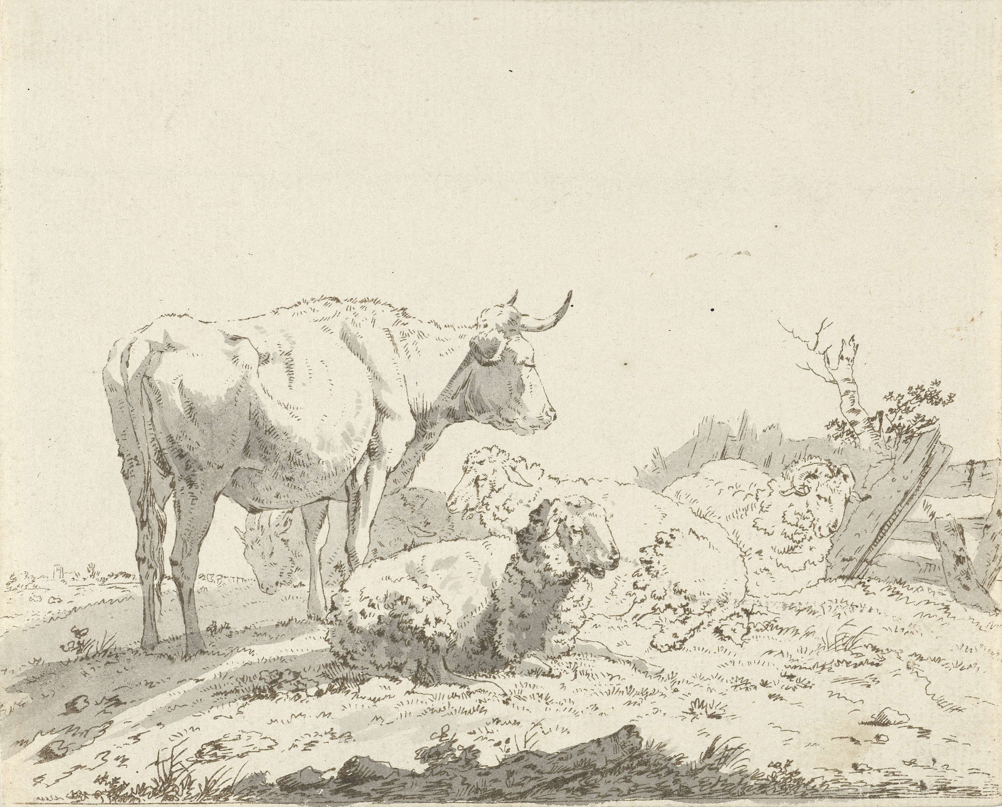 In een glooiend landschap staat een koe bij een hek. Naast de koe liggen twee schapen, een ram en een bok.