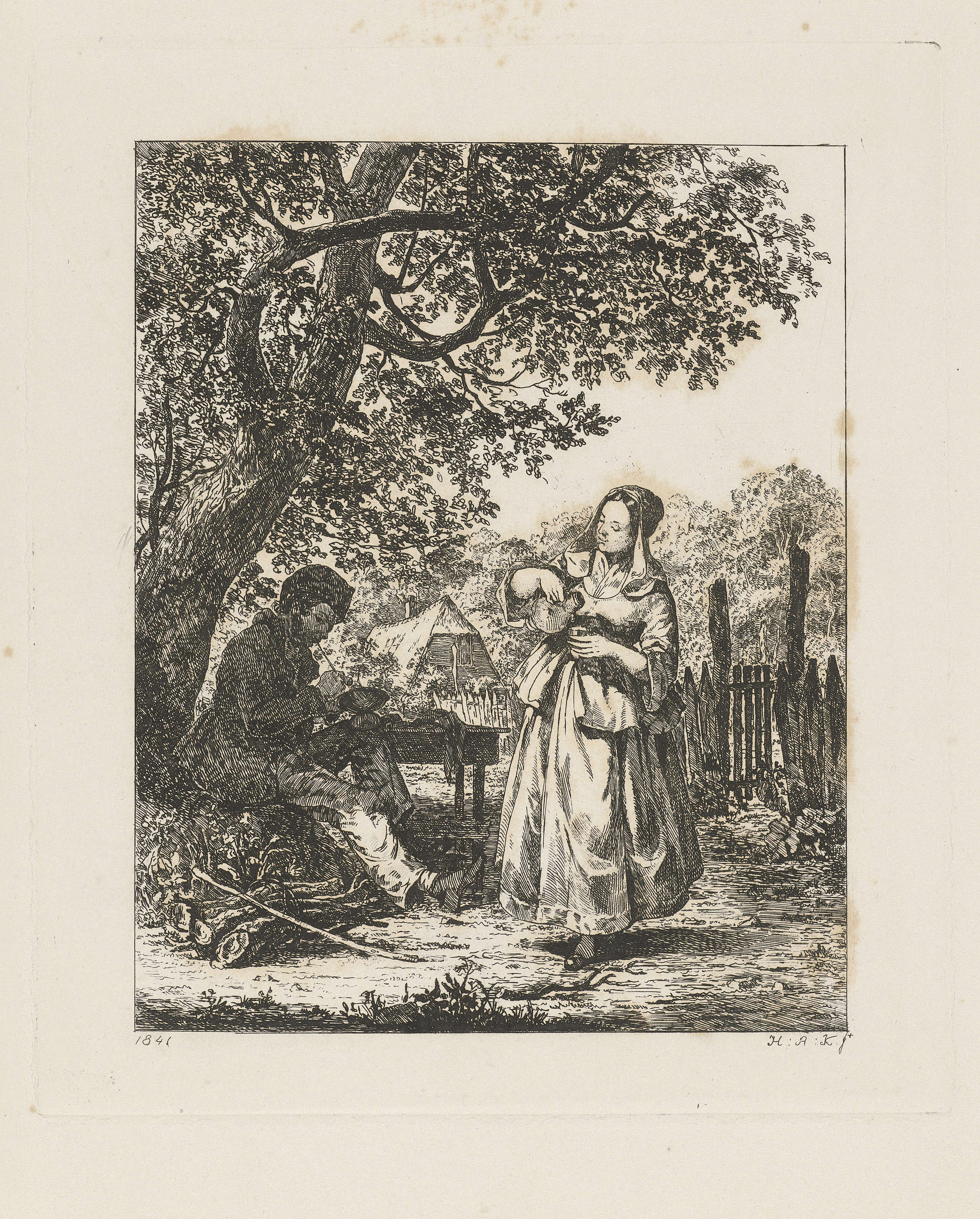 Bij een boerenhoeve in de schaduw van een boom steekt een man zijn pijp aan, terwijl een jonge vrouw zijn beker vol schenkt. De hoeve is omgeven door bomen en om de tuin en het huis staat een omheining van hout.