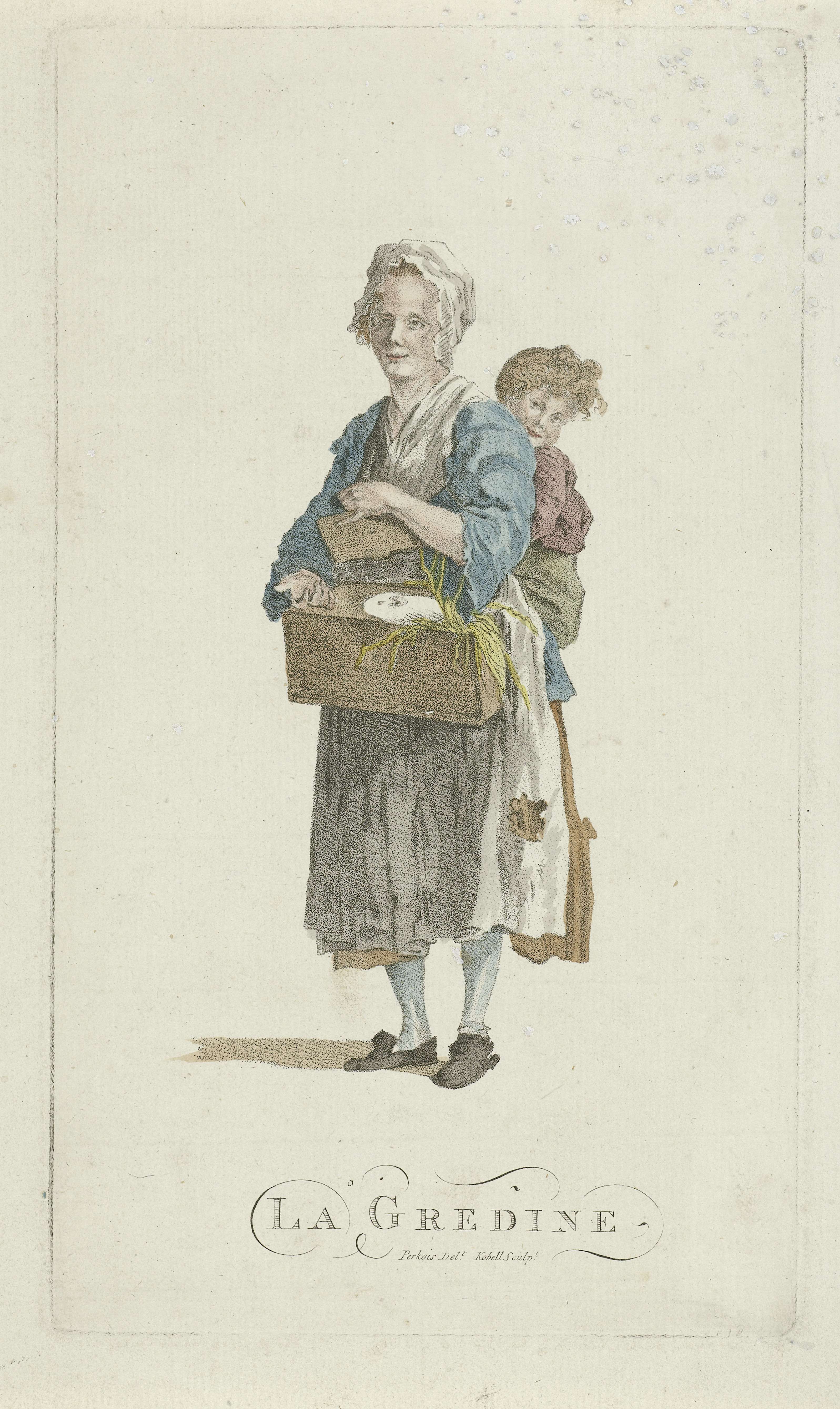 Een vrouw met een klein kind op haar rug, toont een witte cavia in een kistje. Het schort van de vrouw is gescheurd en uit het kistje puilt stro.