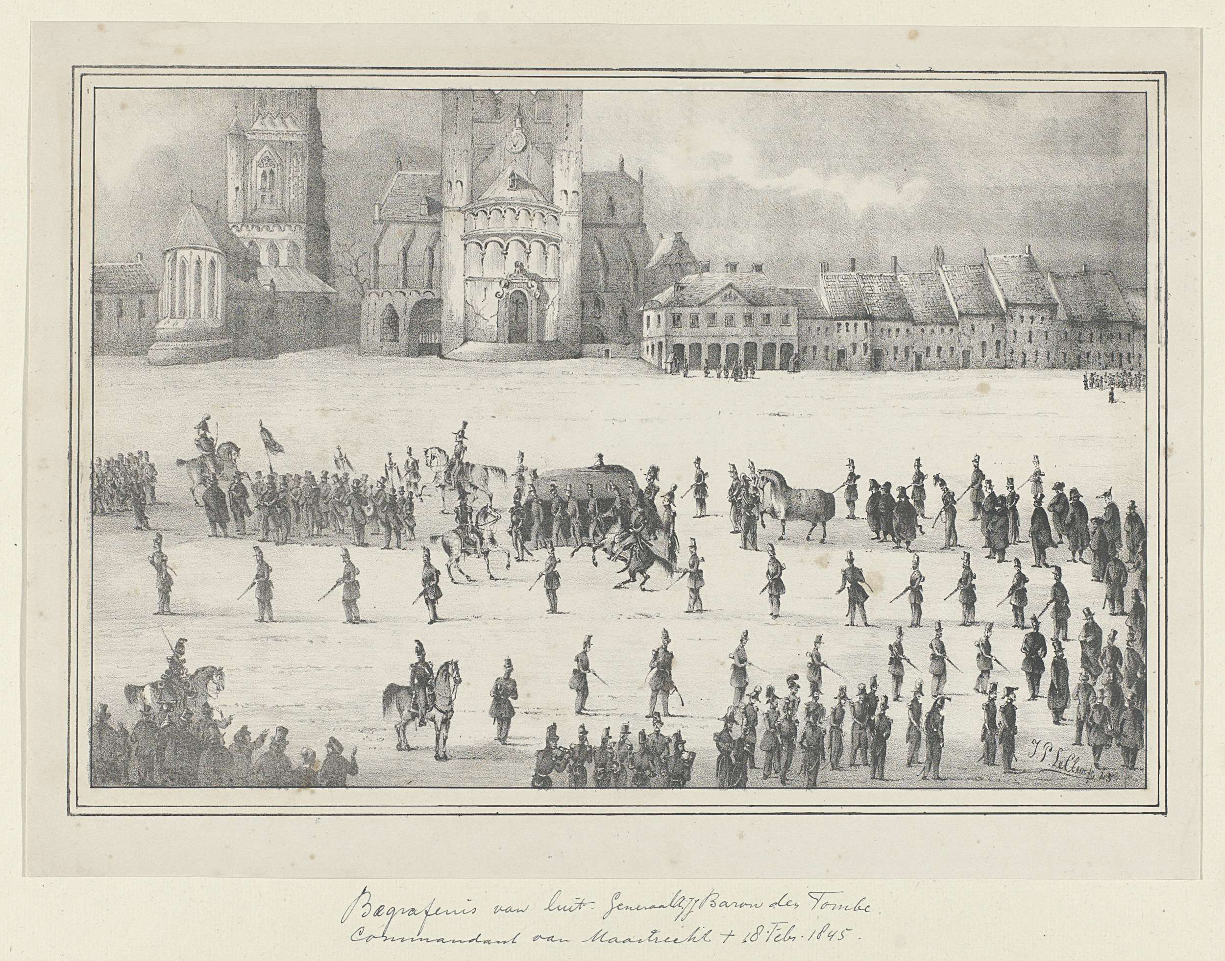 Begrafenis van luitenant-generaal A.J.J. Baron des Tombe, commandeur van Maastricht, overleden op 18 februari 1845. De begrafenisstoet trekt over het Vrijthof langs de Sint-Servaasbasiliek.