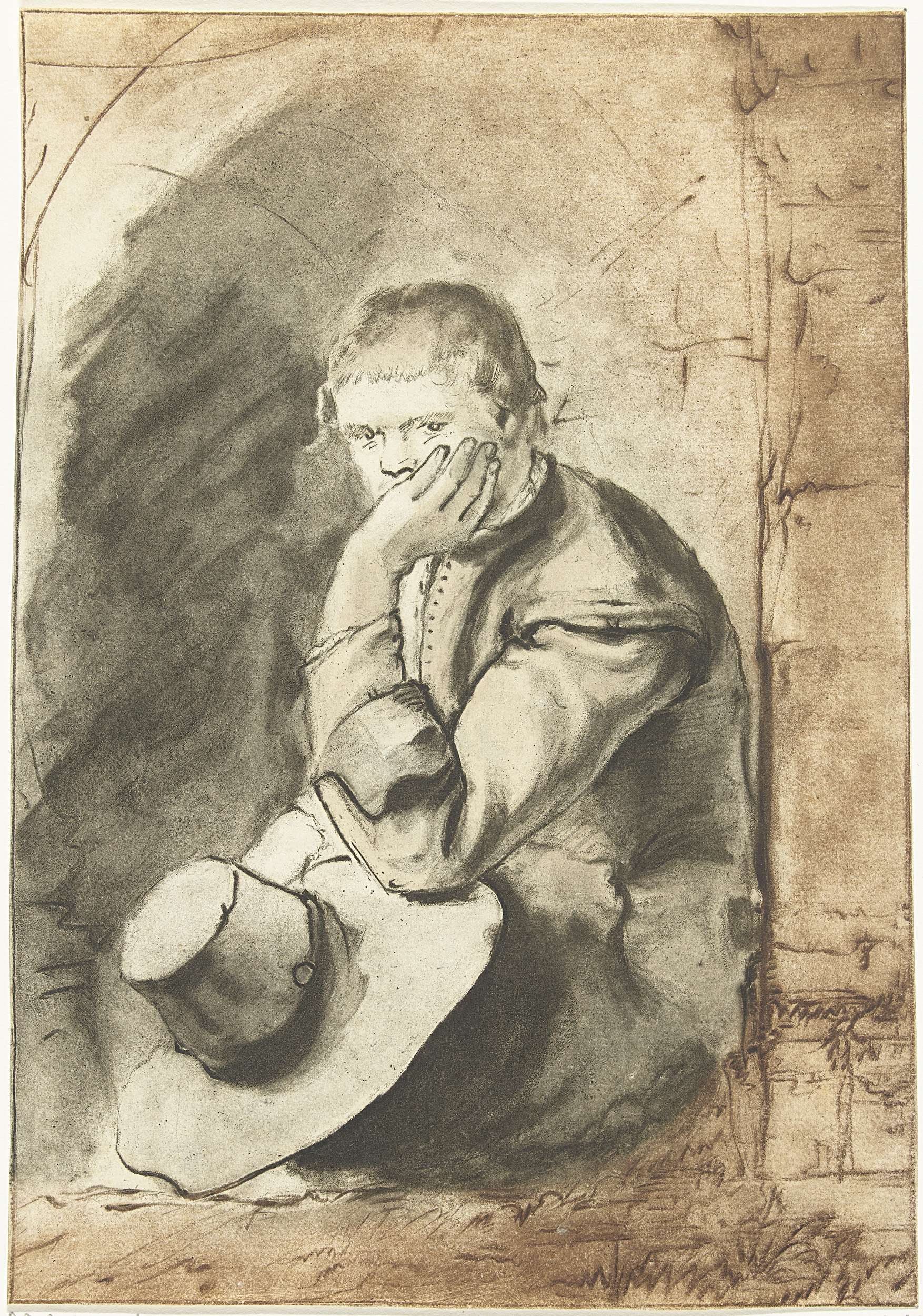 Een man zit in een nis. Met zijn ene hand ondersteunt hij zijn hoofd. In zijn andere hand houdt hij zijn hoed vast.