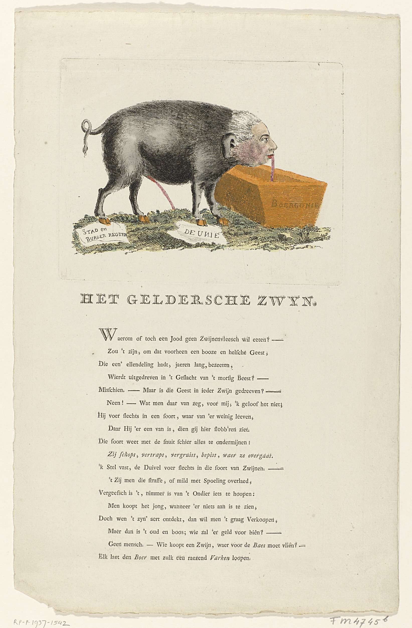 Spotprent op stadhouder Willem V, 1786. De prins afgebeeld als een zwijn dat drinkt uit een bak met Bourgogne wijn en tegelijkertijd spuugt, de stads- en burgerrechten vertreedt en urineert op de Unie. Op het blad onder de plaat een vers van 18 regels.