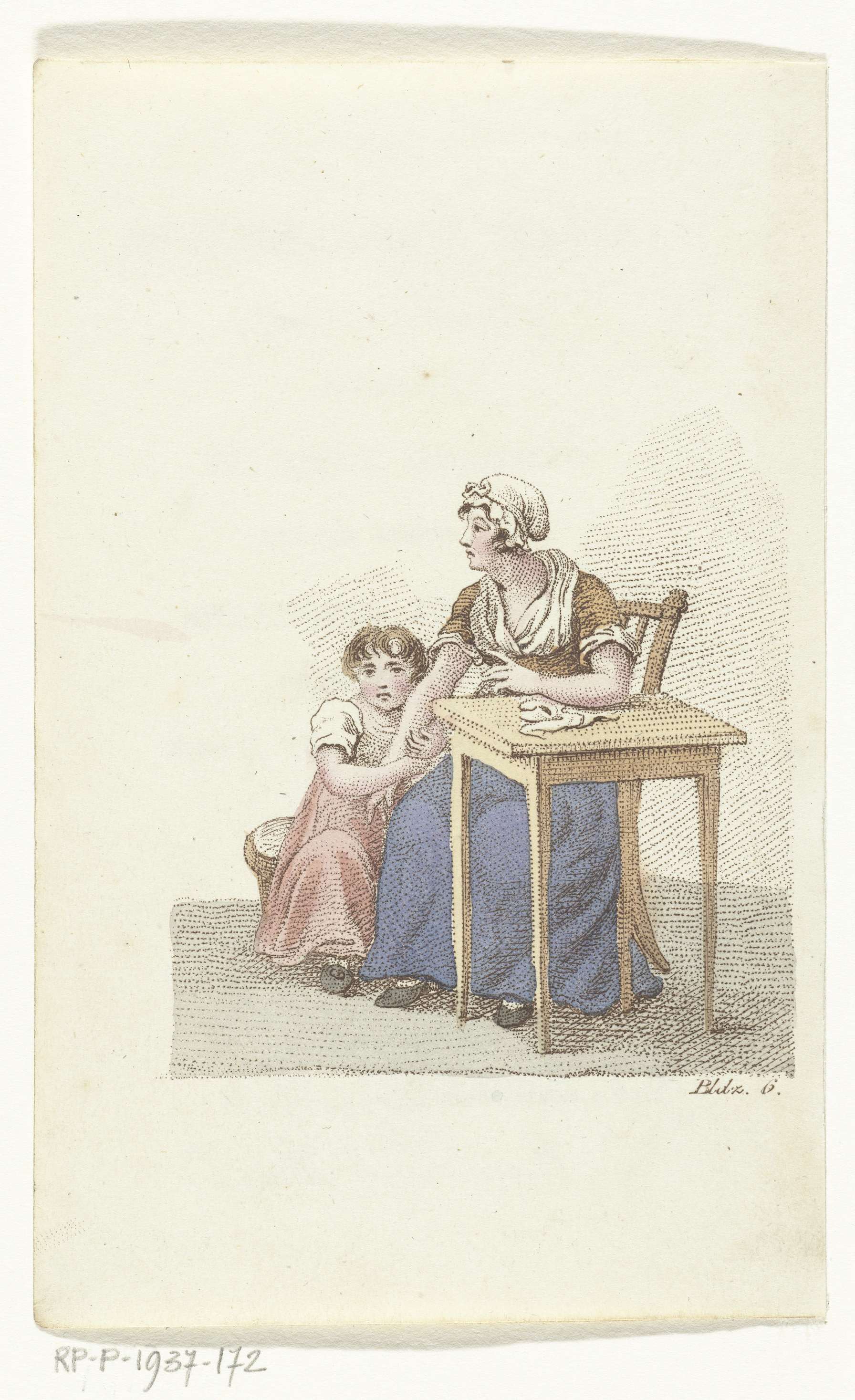 Maria en dienstmeid zitten bij een tafeltje. Aan de prent is de titelpagina gehecht met titel De moederlooze Maria, een verhaal waaruit de lieve kinderen kunnen leeren, dat braafheid en deugd in iederen stand hare belooning vinden