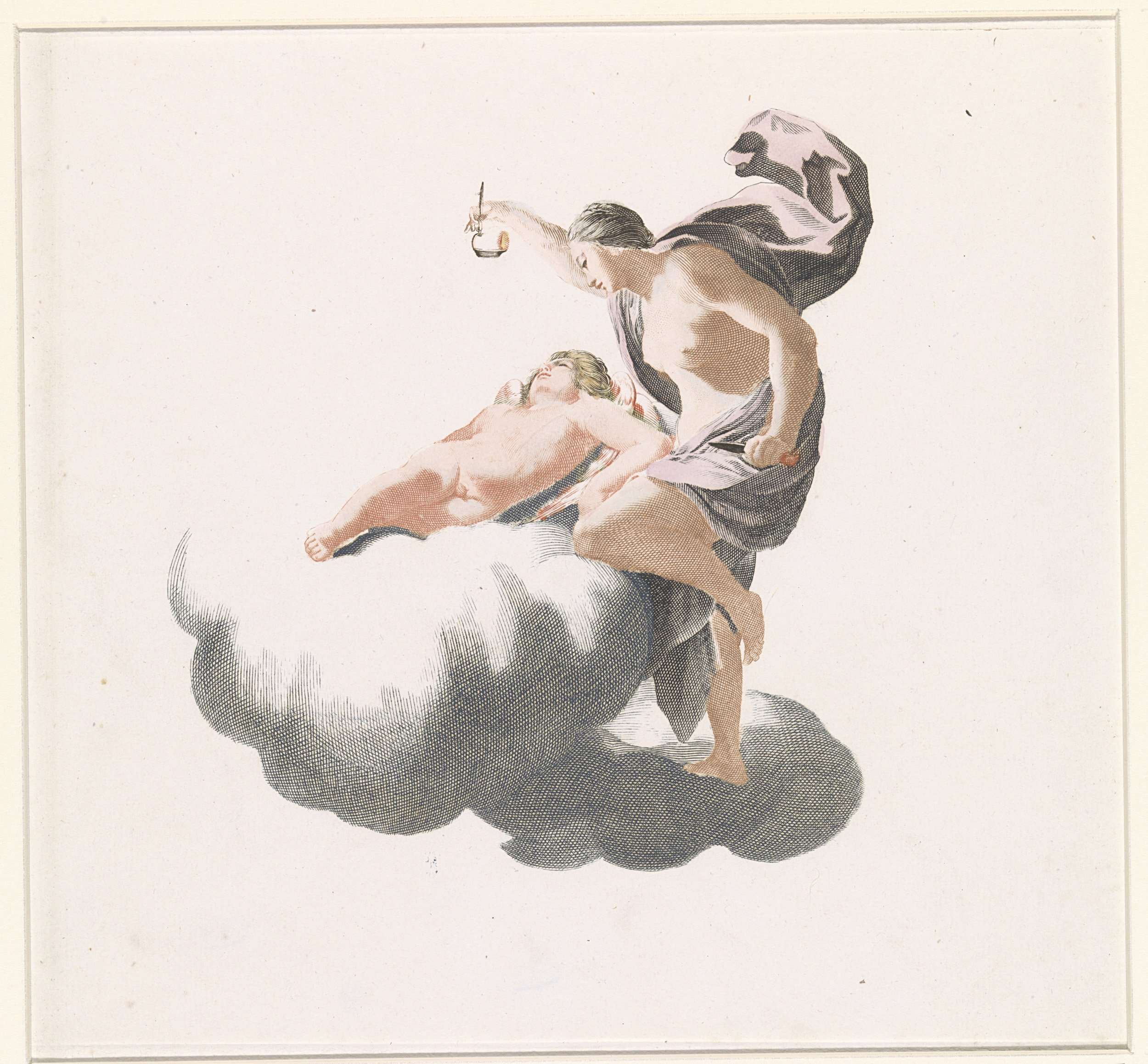 Psyche bespiedt de god Amor in zijn slaap. Zij heeft een olielamp en een dolk in haar handen. Psyche schrikt door de schoonheid van Amor en knoeit een druppel olie uit haar lamp, waardoor hij zal ontwaken.