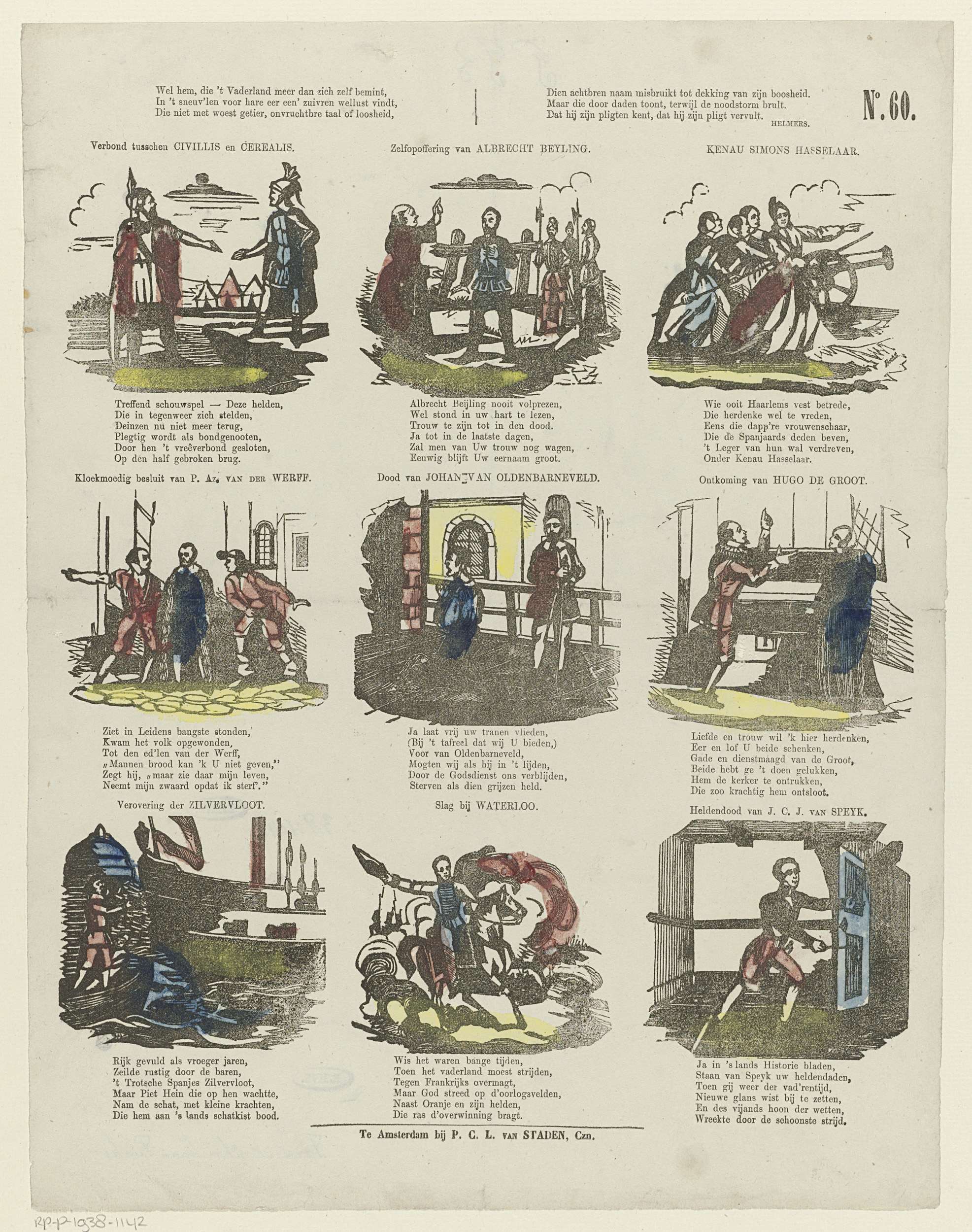 Blad met 9 voorstellingen uit de vaderlandse geschiedenis, waaronder de onthoofding van Johan van Oldenbarnevelt, Hugo de Groot ontsnapt uit Loevestein in de boekenkist en de Slag bij Waterloo. Onder elke afbeelding een zesregelig vers en boven elke afbeelding een titel. Genummerd rechtsboven: N. 60.