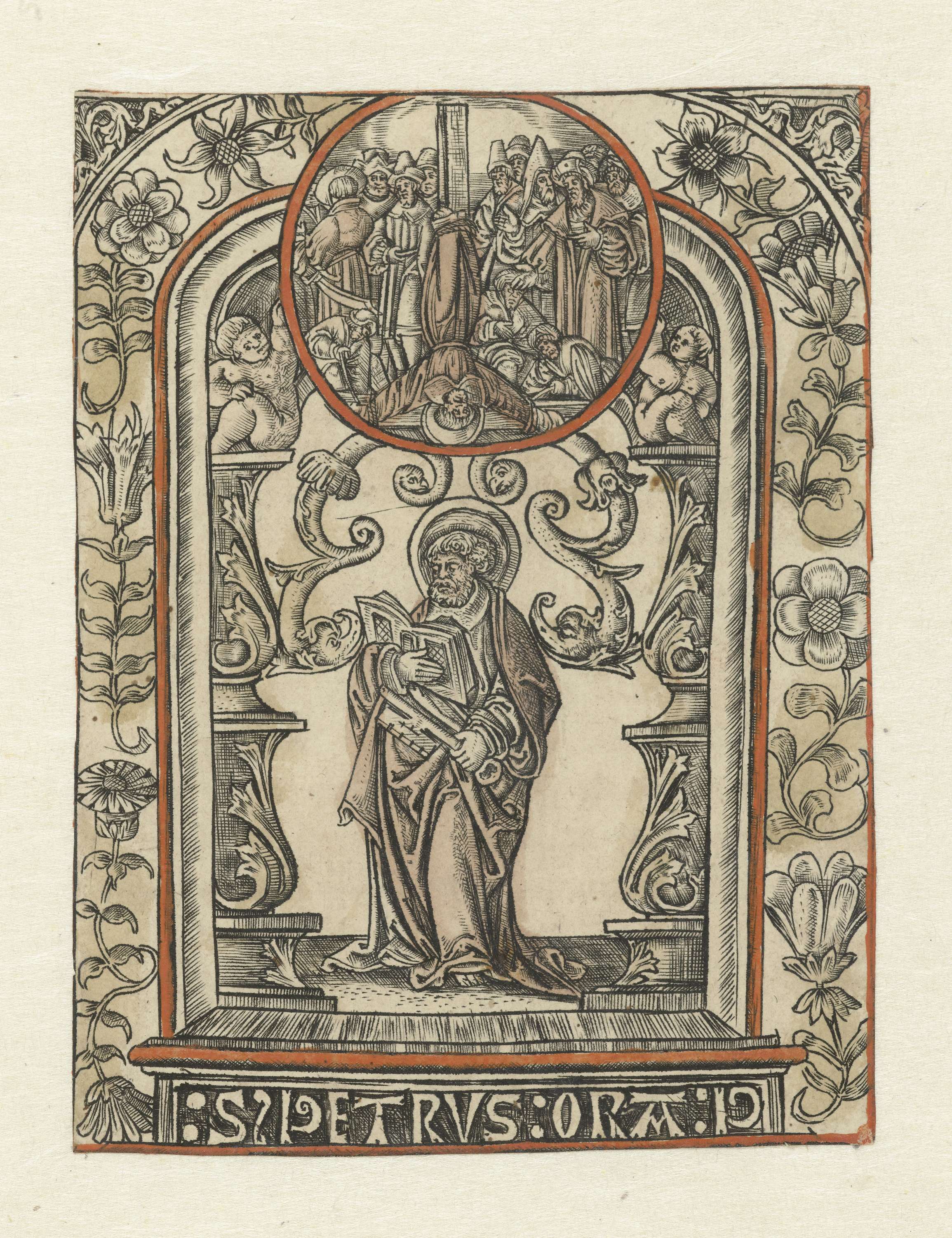 Prent uit serie van twaalf. Apostel Petrus met boek en sleutel in een omlijsting met bloemen. Cirkel met voorstelling van omgekeerde kruisiging van Petrus. Los blad met handgeschreven tekst in zwart en rood.