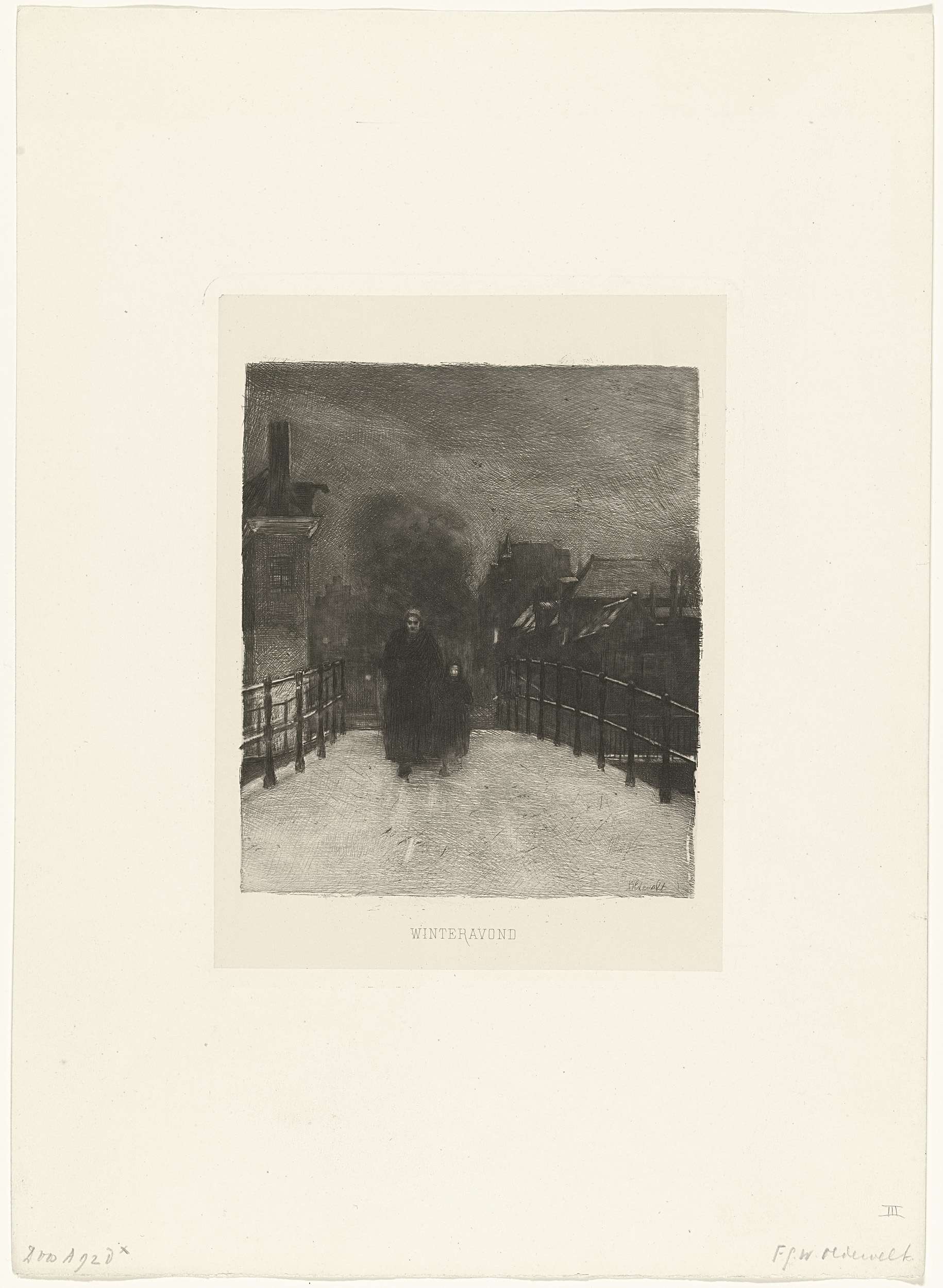 Wintergezicht met een oude vrouw en een kind die over een brug lopen. Waarschijnlijk de brug op de hoek van de Spiegelgracht en de Lijnbaansgracht in Amsterdam.