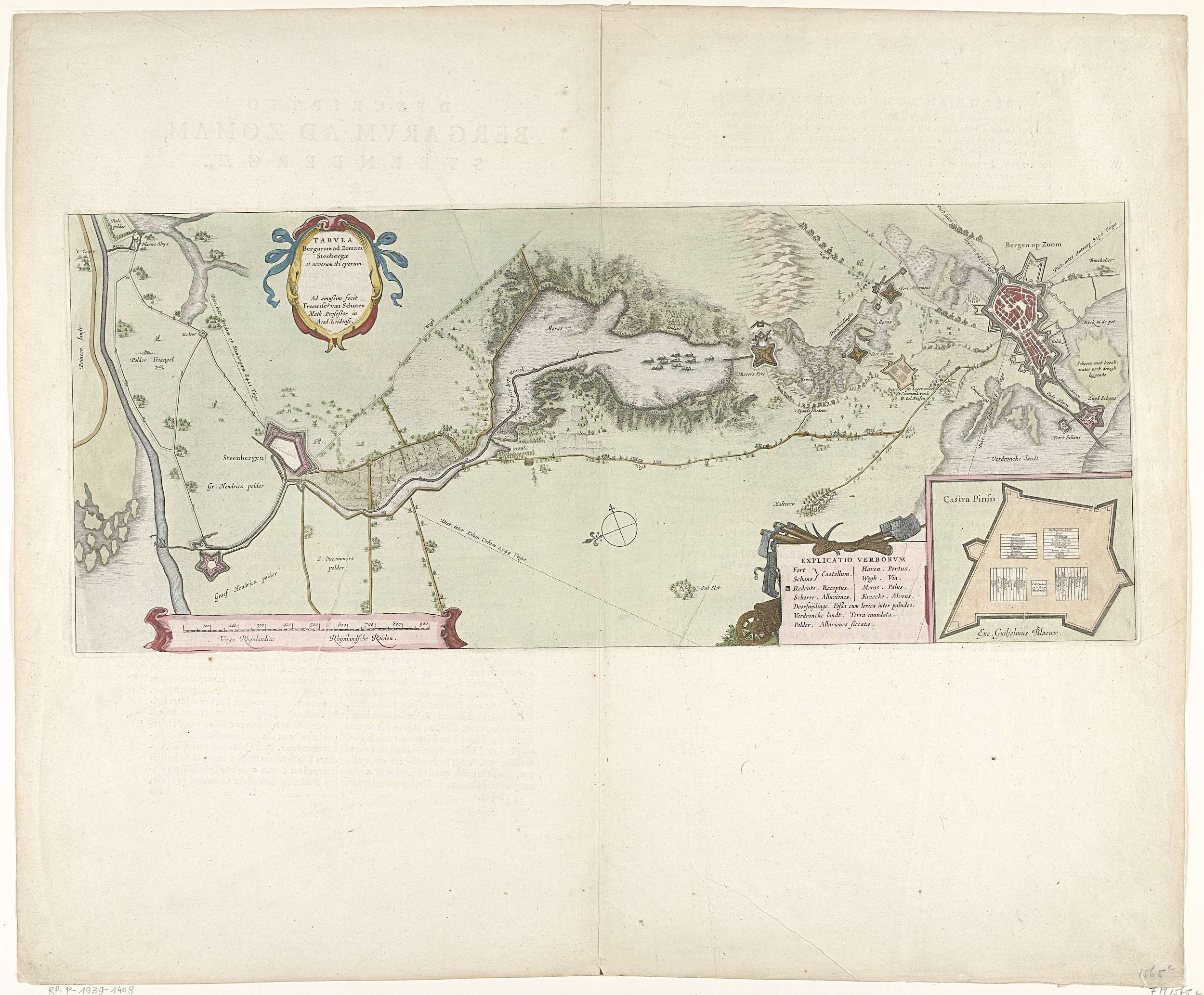 Kaart van het mislukte beleg van Bergen op Zoom door het Spaanse leger onder Spinola en Velasco, 18 juli - 3 oktober 1622. Kaart van Bergen op Zoom met het gebied tot Steenbergen. Met drie cartouches met de Latijnse titel, een woordenverklaring Nederlands-Latijn en de plattegrond van het Fort Pinsen (Castra Pinsii). Op een dubbelblad ...