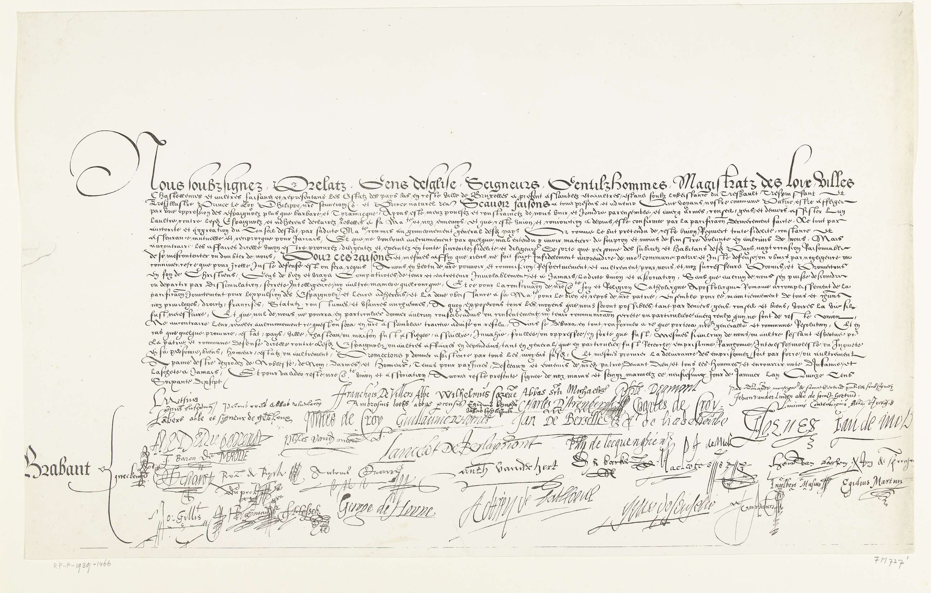 Eerste blad van de facsimile van het geschrift van de Unie van Brussel met handtekeningen, 1577
