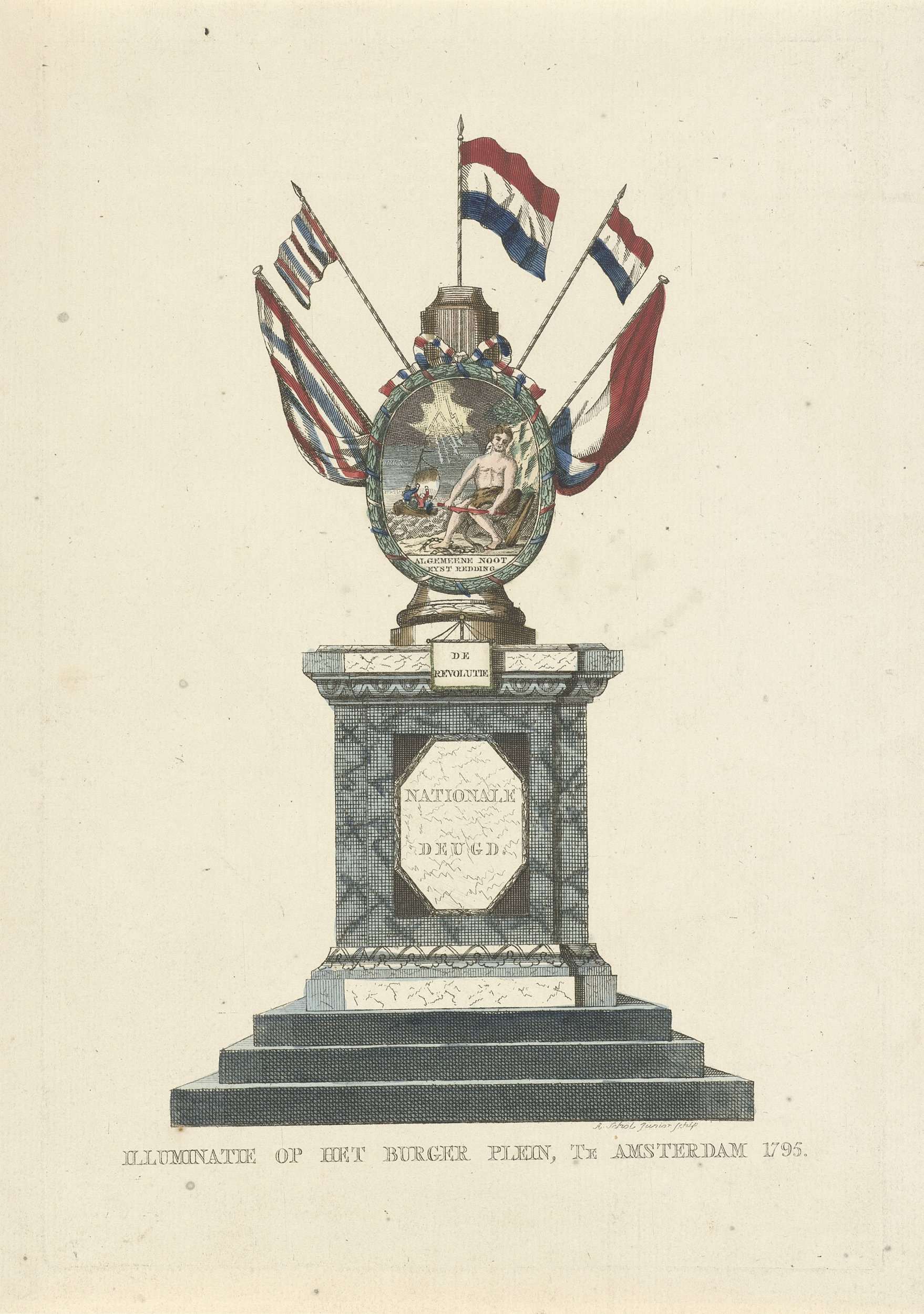 Prent ter gelegenheid van het vrijheidsfeest op het Burgerplein te Amsterdam in 1795. Op een sokkel staat een met Nederlandse en Franse vlaggen versierde voostelling.