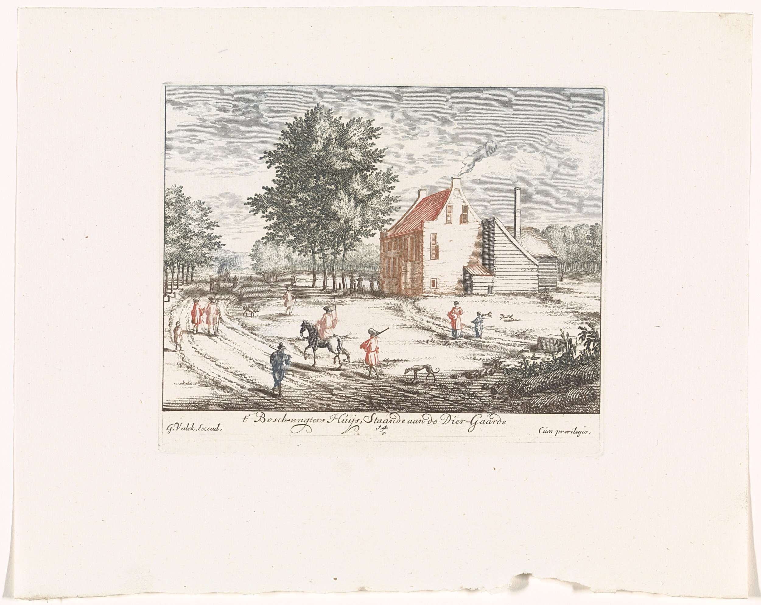 De boswachterswoning van en bij Paleis Soestdijk, jachtslot van stadhouder Willem III van Oranje-Nassau. Op de voorgrond een ruiter en wandelaars op de weg.